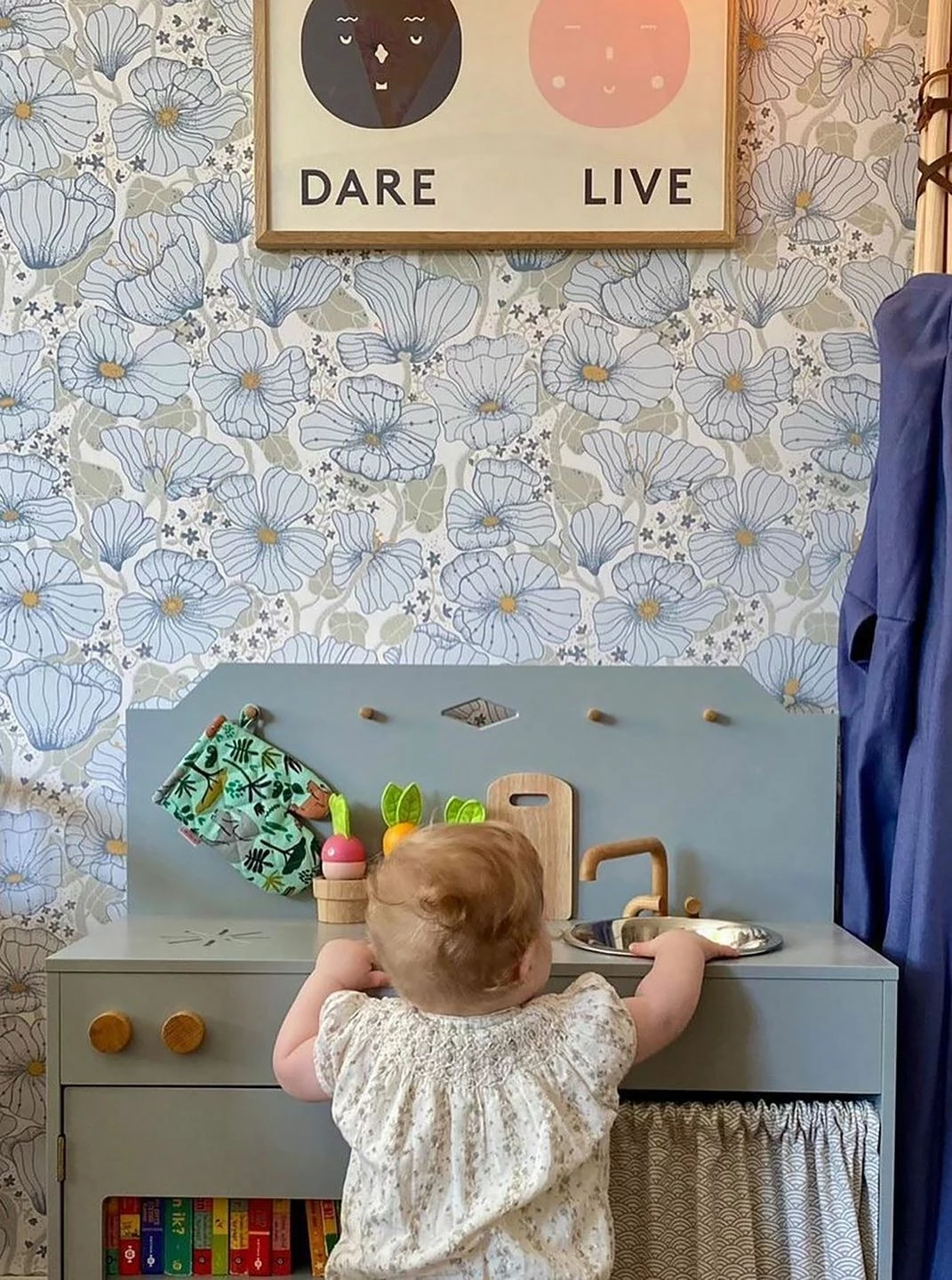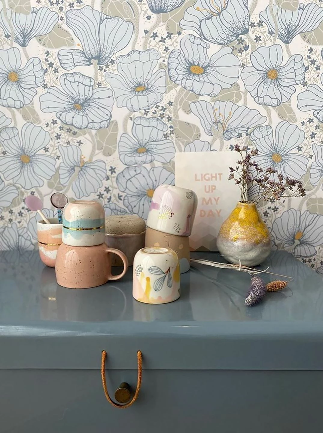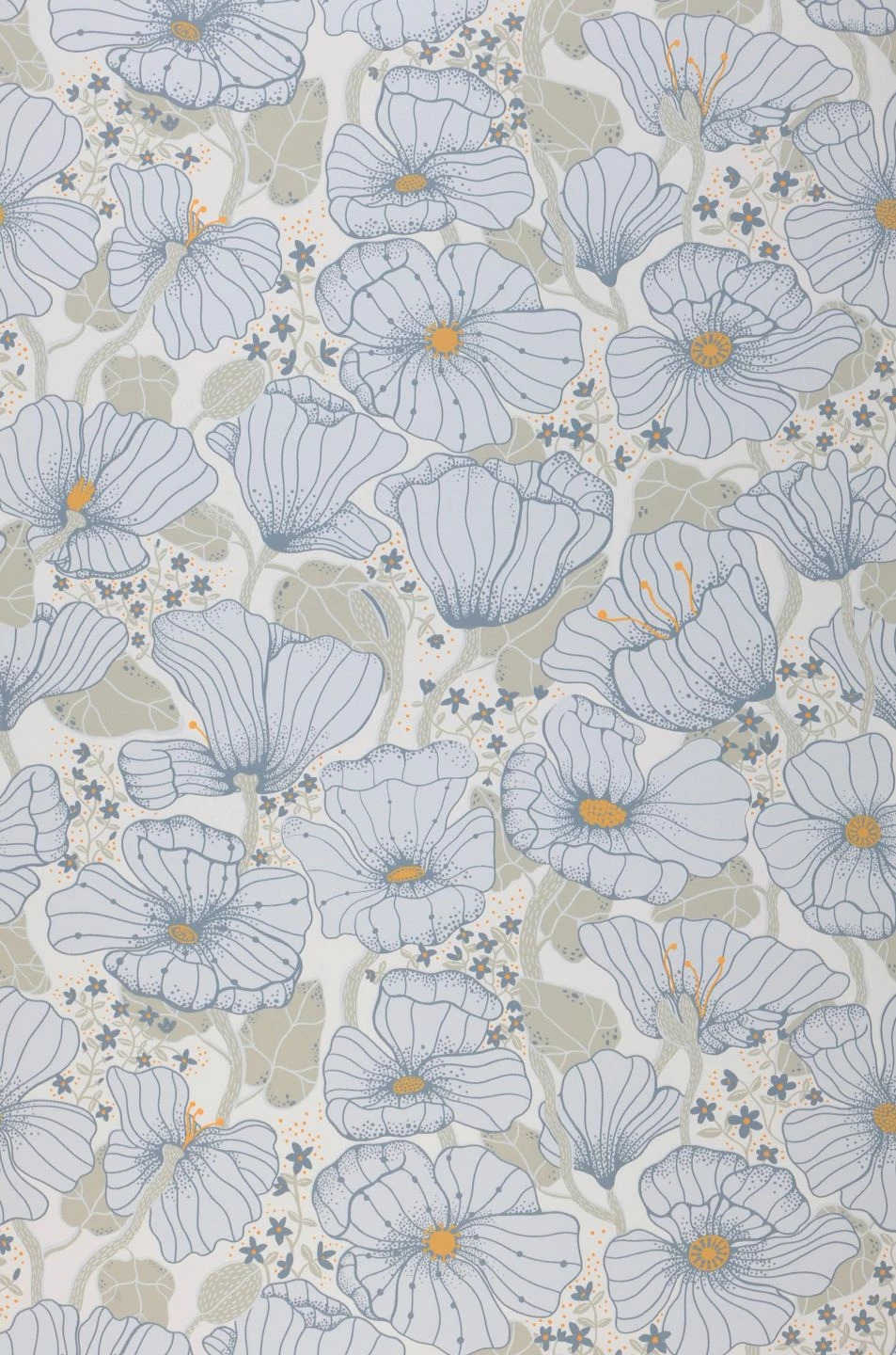 Fast durchscheinend wirken die großen, zartblauen Blüten, zwischen denen die olivgrauen Blätter fast mit dem cremeweißen Untergrund verschmelzen. Die graublaue Zeichnung der Blüten, die orangefarbenen Details und die kleinen sternförmigen Blüten in den Zwischenräumen erschaffen eine zauberhaft ausgeglichene Atmosphäre. Zwischen hellen Schlafzimmermöbeln oder in Ihrem Wohnzimmer macht die Vliestapete Ewa eine gute Figur.
