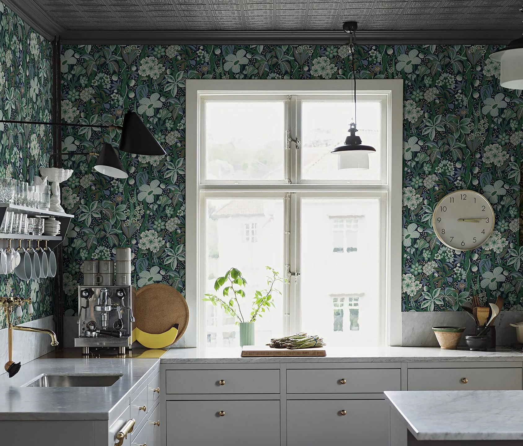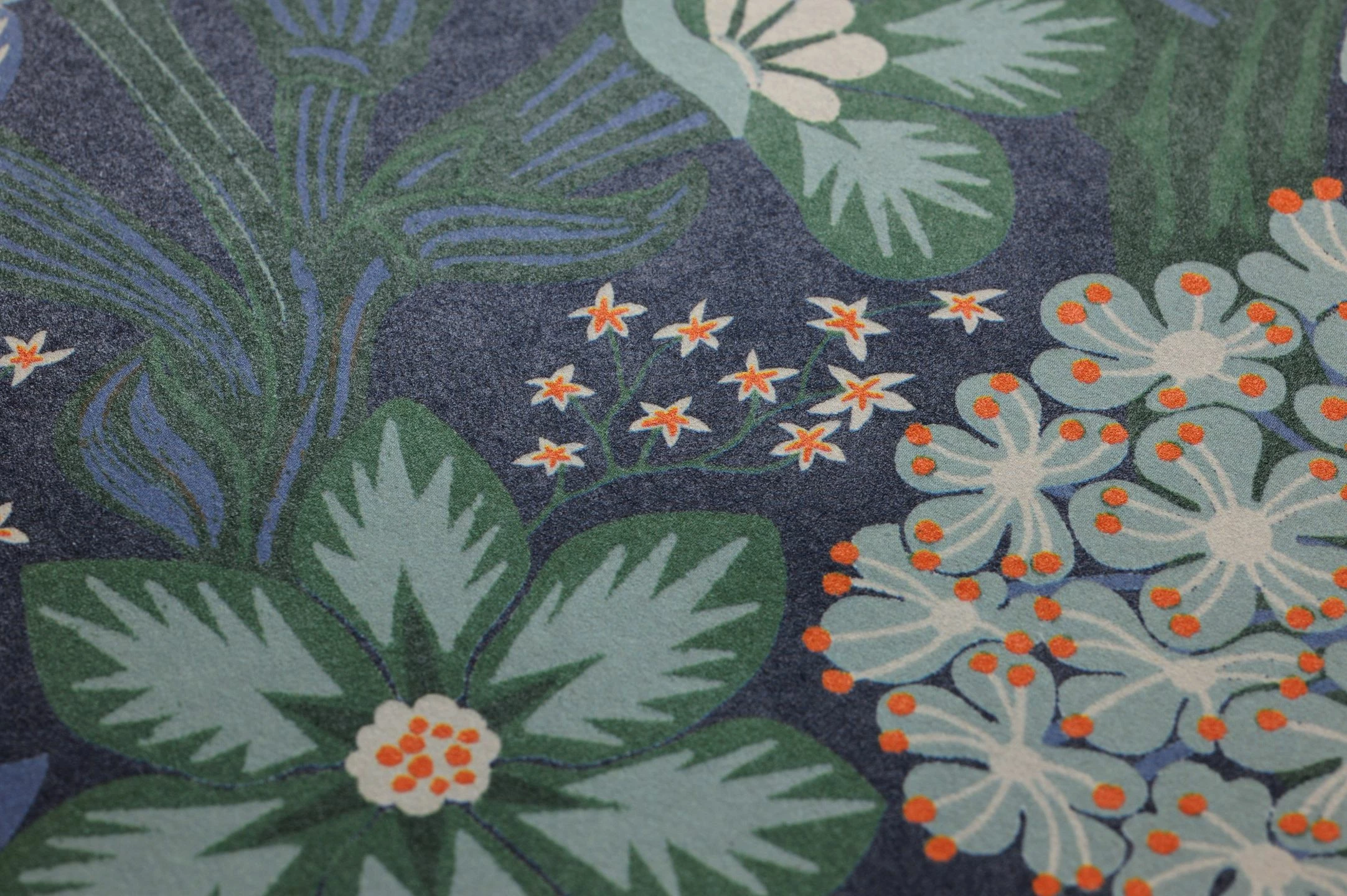 Die Auswahl von Grün- und Blautönen und Weiß gibt der schier überbordenden Fülle und Vielfalt unterschiedlich geformter Blumen und Blätter einen inneren Zusammenhalt und erzeugt eine perfekte Synthese aus Ruhe und Lebendigkeit. Details in kräftigem Orange heben sich in wohlkalkuliertem Kontrast von den ruhigen Blattfarben ab. Fanfara bildet einen wunderschönen Gegenpart zu weißen Möbeln und lässt sich attraktiv mit einer passenden Wandfarbe kombinieren.