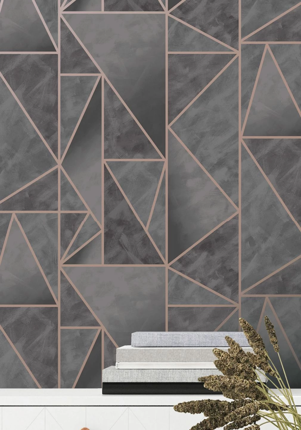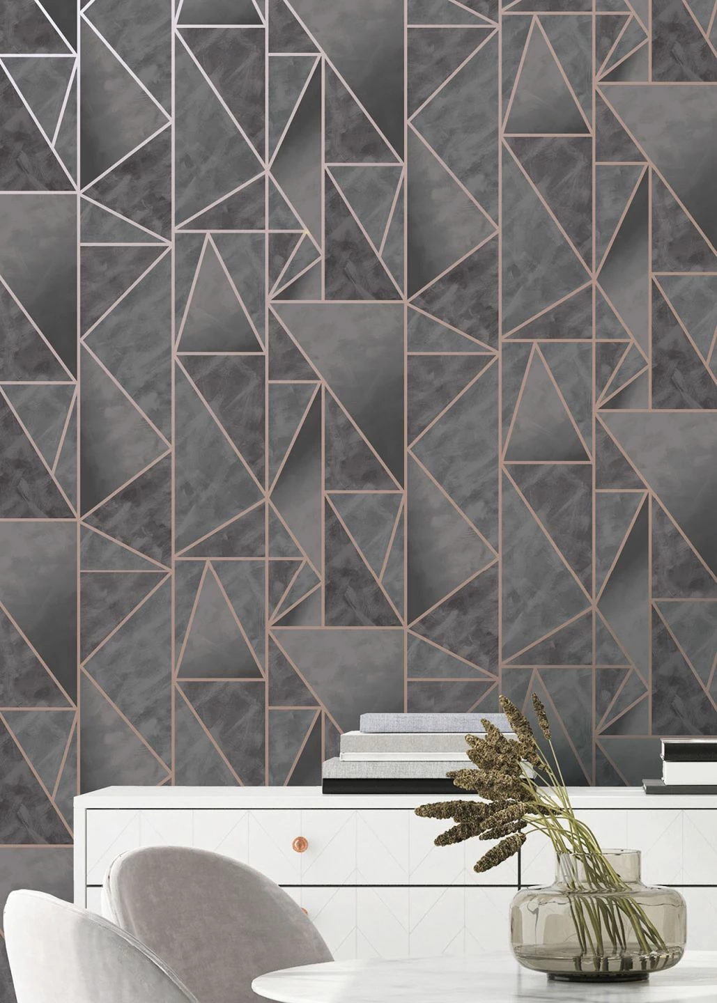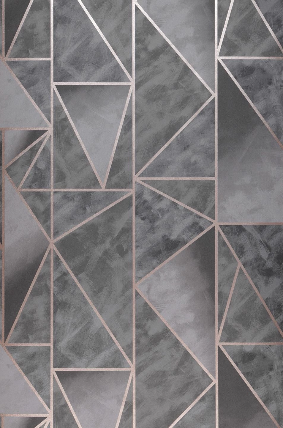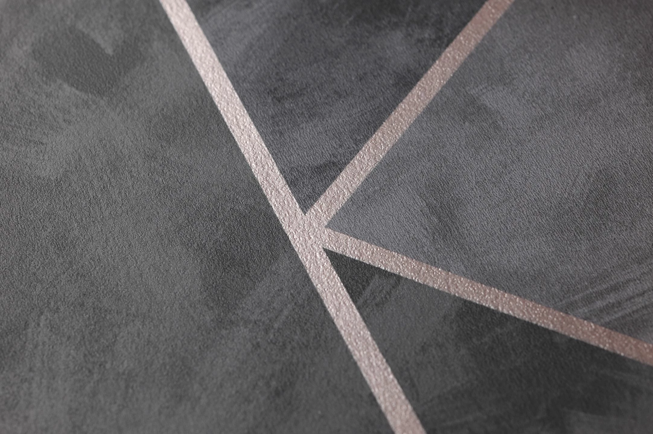 Dreiecke verschiedener Größe und Ausrichtung in sanft ineinander übergehenden, dunklen Grautönen werden von schmalen Streifen in schimmerndem Roségold voneinander abgesetzt. So wirken sie wie raffiniert verlegte Kacheln und verleihen Ihrer Wand eine reizvolle Struktur. Die Schattierungen von Grau harmonieren mit einer Vielzahl von Farben und lassen die Vliestapete auf unaufdringliche Weise elegant wirken.
