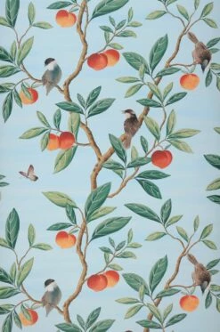 Wie vor einem wolkenlosen Sommerhimmel heben sich die Zweige von Obstbäumen mit Blättern und reifen Früchten und die darauf sitzenden Singvögel vom zartblauen Hintergrund ab. Zwischen den Zweigen flattern einzelne Schmetterlinge durch die sonnendurchflutete Luft. Mit ihrem harmonischen, sonnigen Muster bringt Ihnen Vliestapete Fortuna die Atmosphäre eines warmen Sommertags ins Haus.