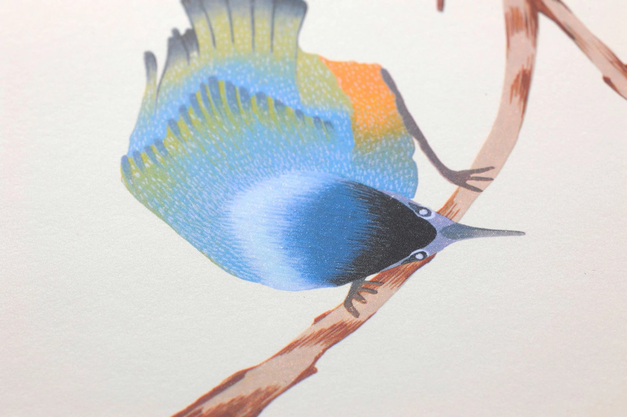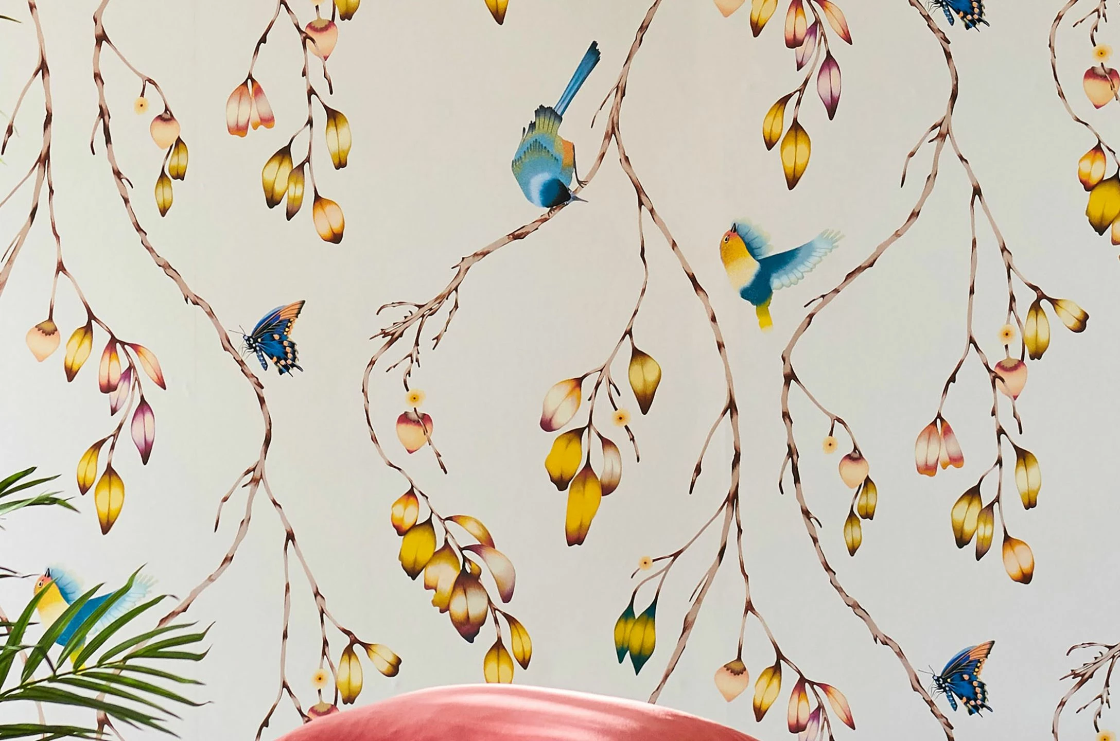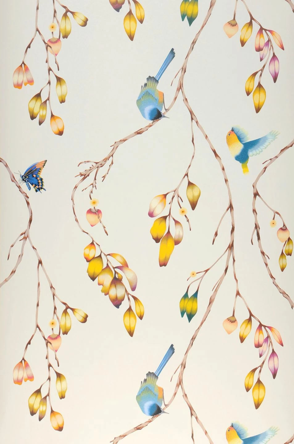 Wie das romantische Frühlingserwachen mutet Design Tapete Francine an. Fröhlich agile Vögel und Schmetterlinge schlagen Kapriolen auf Zweigen. Blau, Braun, Gelb, Hellorange, Rotviolett als Musterfarben bilden eine märchenhafte Harmonie. Die cremeweisse Grundfarbe lässt die Musterelemente wie frei im Raum schweben.