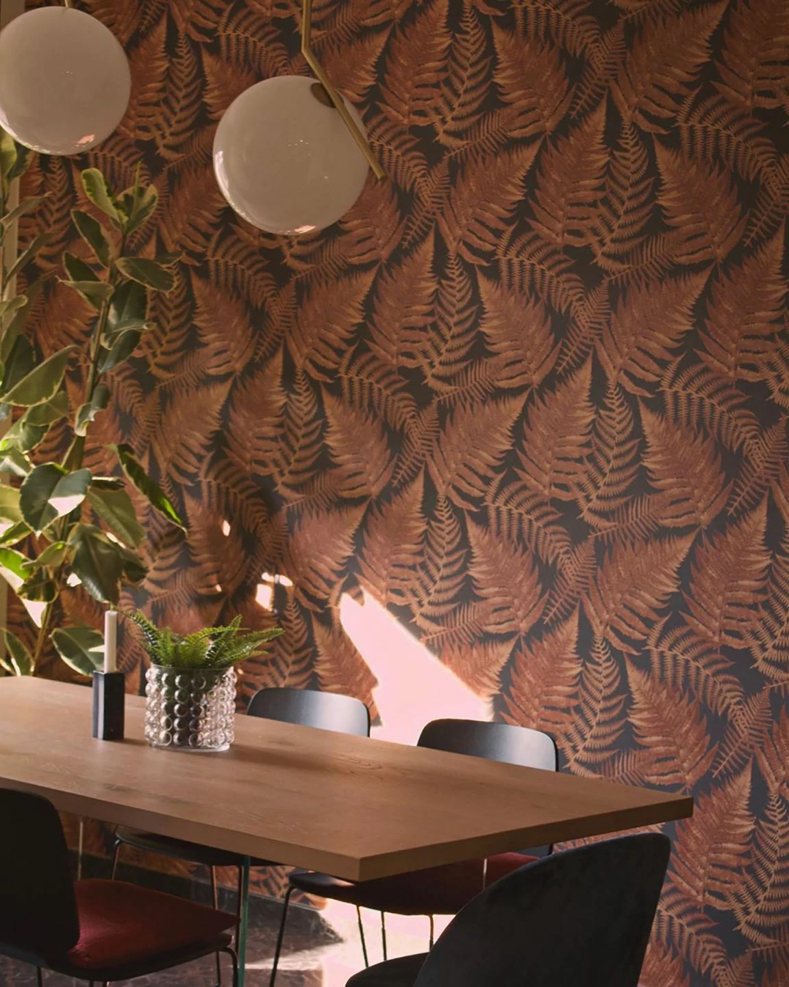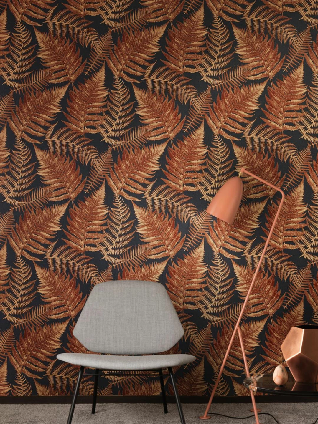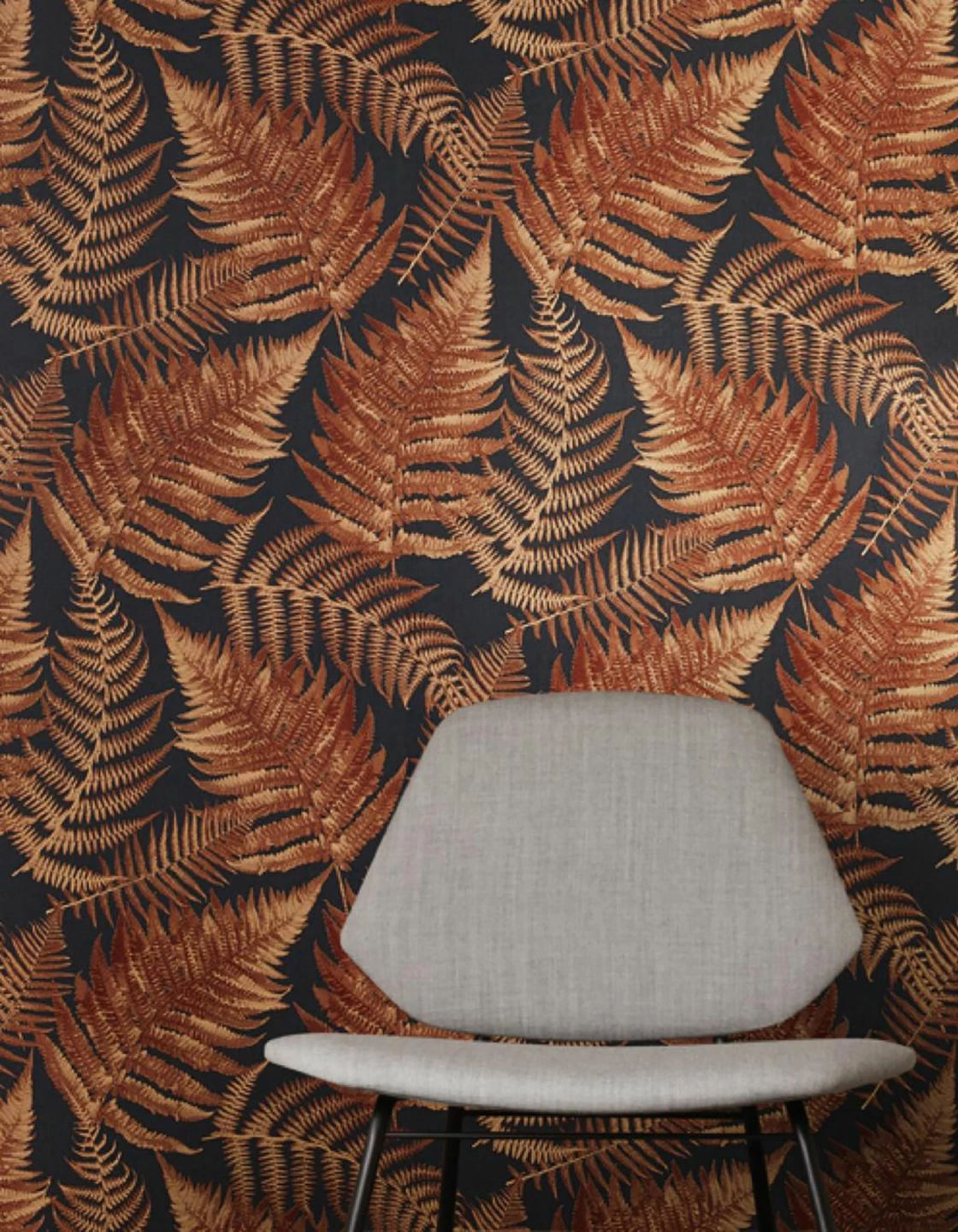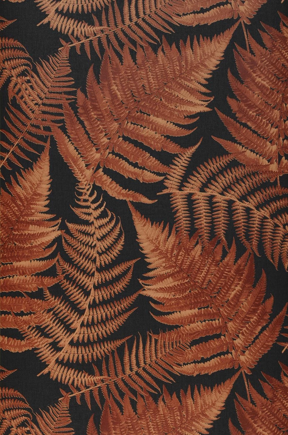 Kastanienbraun mit optischen Variationen zu Kupferrot formt das spielerische Farnmuster auf anthrazitfarbenem Grund zu einem plakativen Gesamtkunstwerk. Die warme Ausstrahlung der floralen Tapete assoziiert Natur und erinnert an einen goldenen Herbsttag. Auch zufriedene Harmonie kommt mit den Farnblättern, die sich ineinander schmiegen, zum Tragen.
