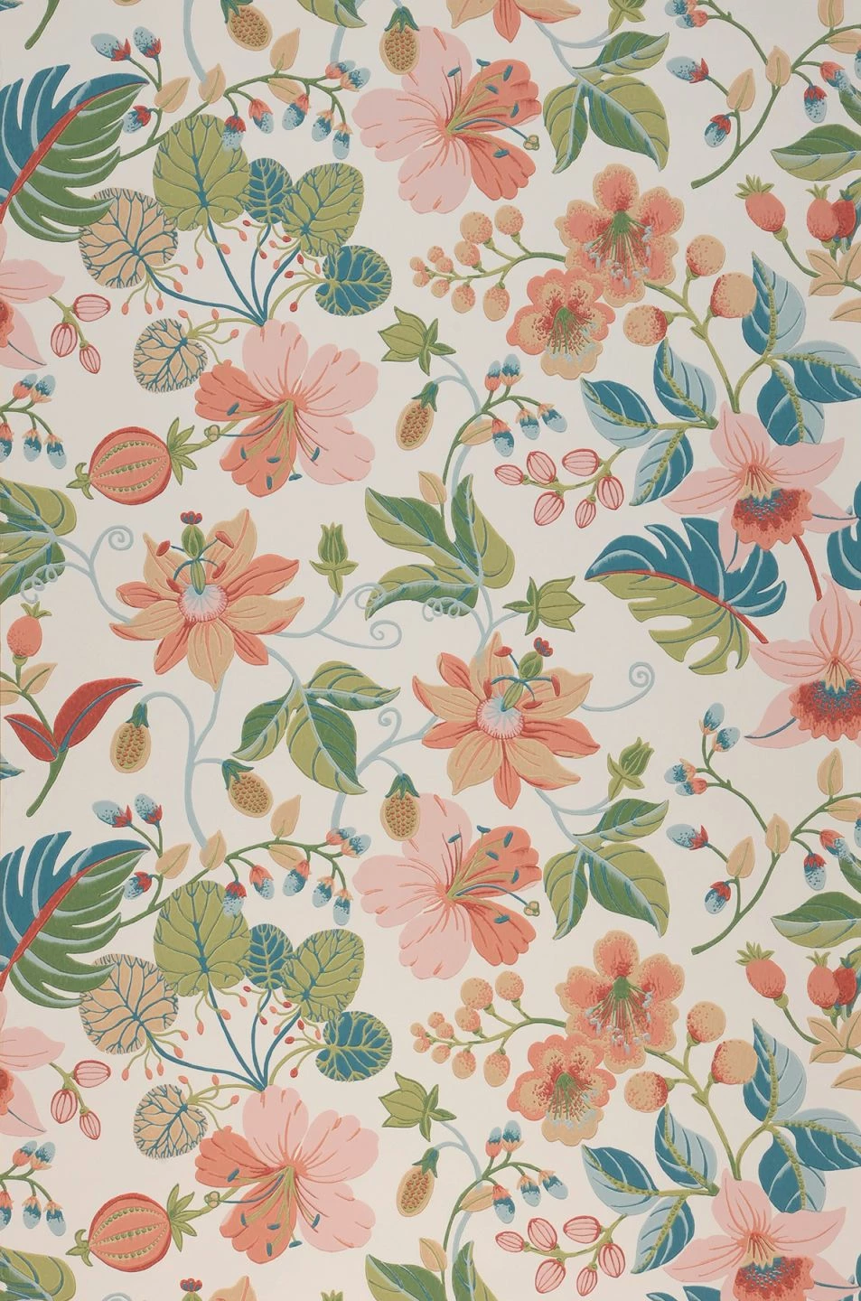 Der mexikanische Frühling wie ihn die Künstlerin Frida Kahlo gerne gesehen hätte, lässt auf diesem Mustertapetenexemplar herzlich grüßen. Tauchen Sie ein in die Welt exotischer Blumen und Früchte, die sich hier zu einem hellen Farbreigen aus Cremeweiß, Beige, Pastelltürkis, Hellrosa, Beigerot, Ozeanblau und Grüntönen vereinen.