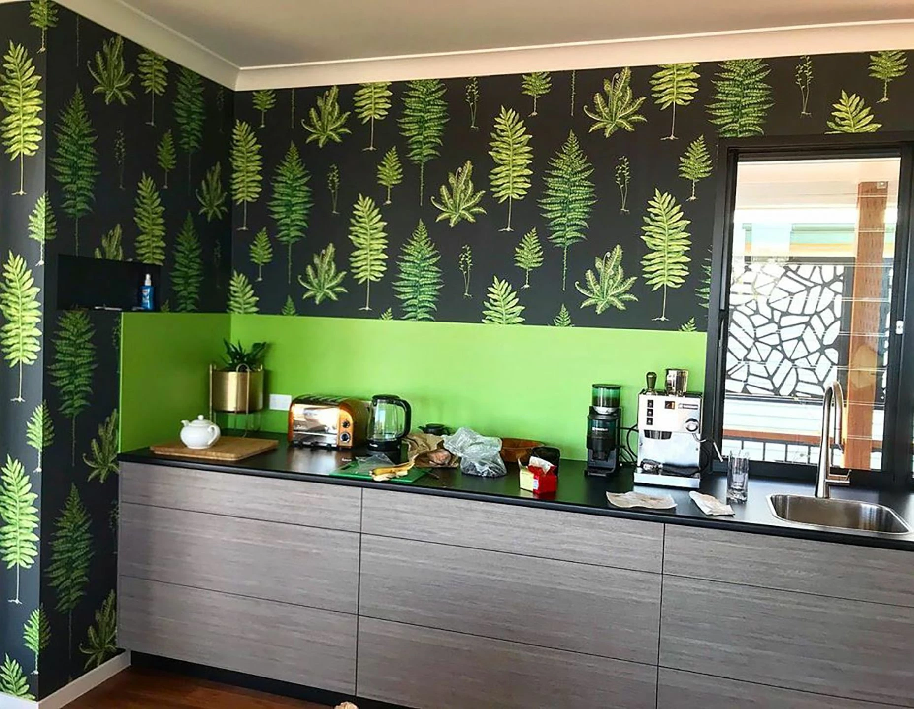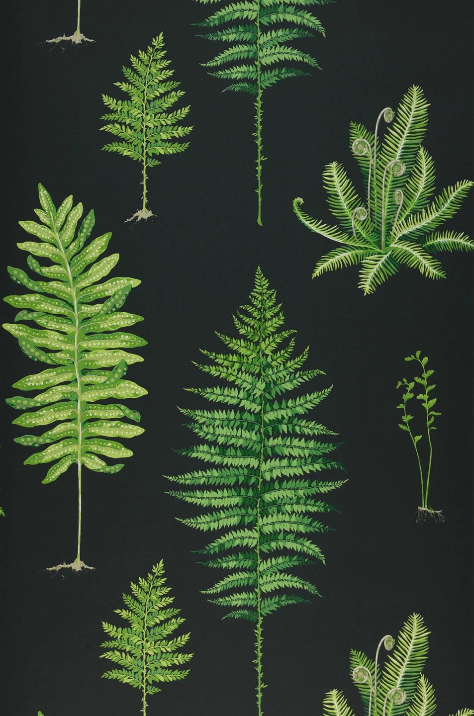 Mit Schwarz als Grundfarbe zeigen die verschiedenen Farnblätter eine völlig neue Seite. Sie wirken geheimnisvoll, wie ein Spaziergang durch den tiefen Wald. Die reizvollen Details der verschiedenen Farne kommen durch den Kontrast deutlich zur Geltung. Die exquisite, abwaschbare Vliestapete fördert die Wahrnehmung und hat einen entspannenden Effekt.