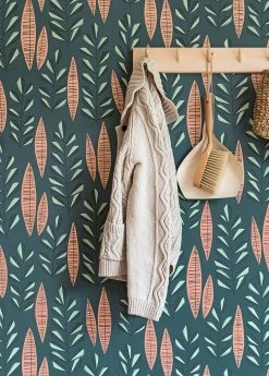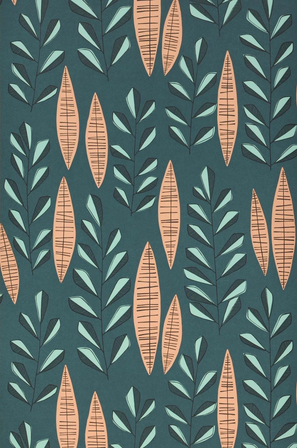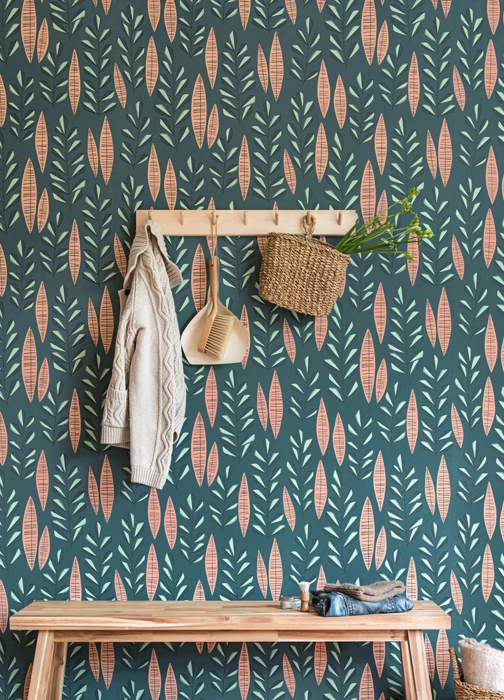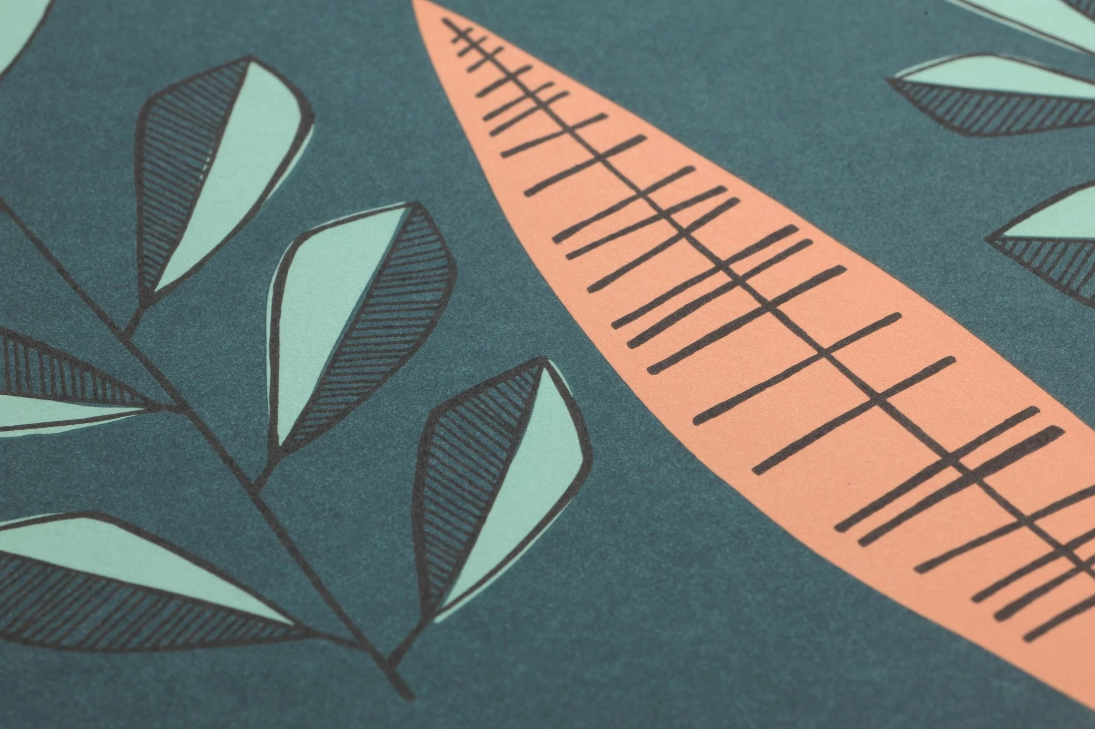 Kühle und warme Farben in einer kontrastreichen Kombination wirken auf dieser Tapete zusammen. Mit wenigen Strichen und einfachen, klaren Formen sind verschiedene Blätter angedeutet. Harmonisch fügt sich das hellgrüne Laub in den dunkel blaugrünen Hintergrund, während große Blätter in einem warmen Beigerot für tolle Akzente sorgen. Zeitgemäß und schlicht mit einem Hauch von Ethno-Kunst schmückt die Vliestapete Küche, Wohnzimmer oder Flur und passt ausgezeichnet zu hellen Naturtönen.