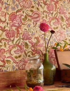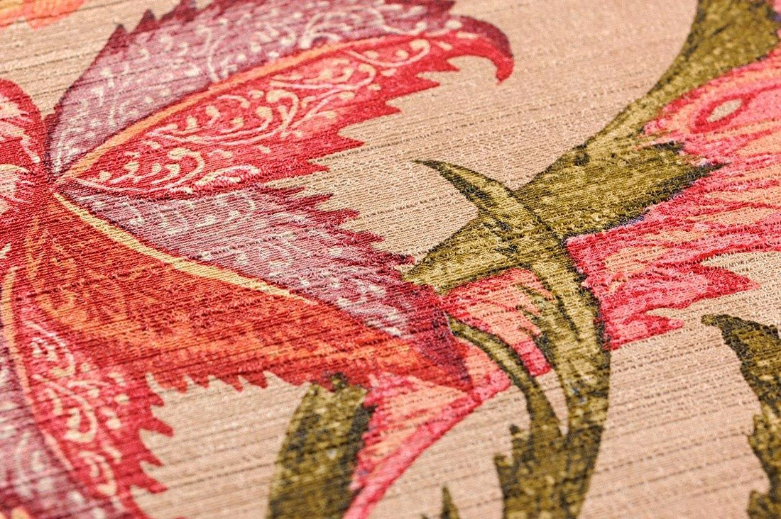 Blumenranken und Blüten im indischen Stil geben der Raumgestaltung mit floralen Tapeten eine neue, ungeahnt dynamische Richtung. In Verbindung mit Farben wie Cremeweiss, Erdbeerrot, Olivgrün, Violett und einer textilen Optik zieht die Designtapete alle Register für eine überwältigende Ausstrahlung im Raum.