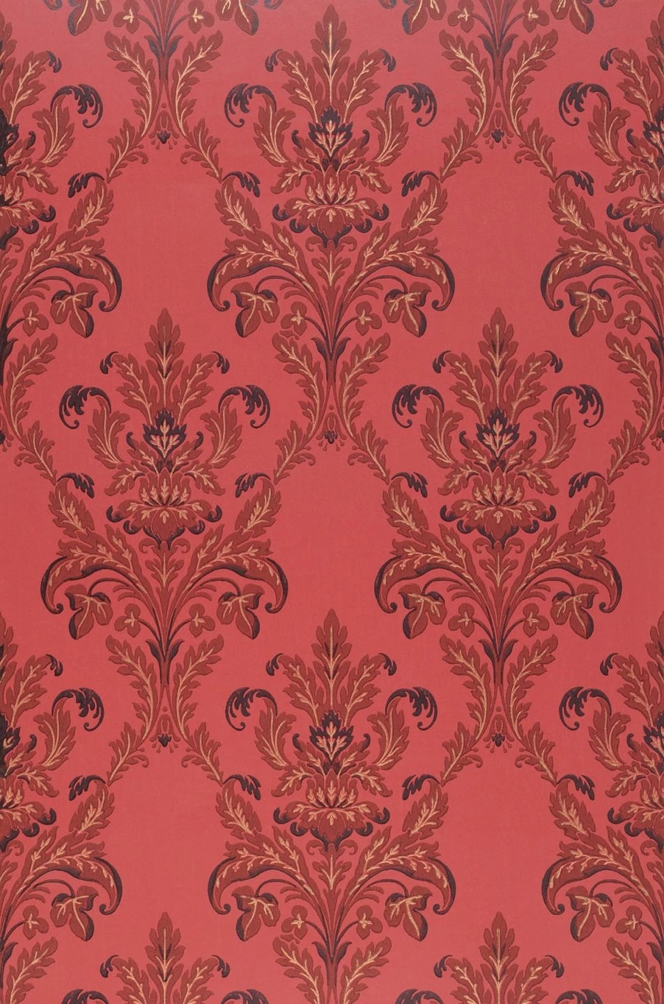 Ein barockes Tapetenmuster in einer sehr sinnlichen, heutigen Version. Die zierlichen Blätter und Ranken der Ornamente entfalten sich auf einem Untergrund in leuchtendem Erdbeerrot, das energiegeladen und aktivierend wirkt. Das Muster in Braunrot und Schwarzbraun wird durch Highlights in Mattgold noch mit einem Hauch von Luxus aufgewertet. Auch die Technik des Leimdruckverfahrens steht für hohe Qualität.
