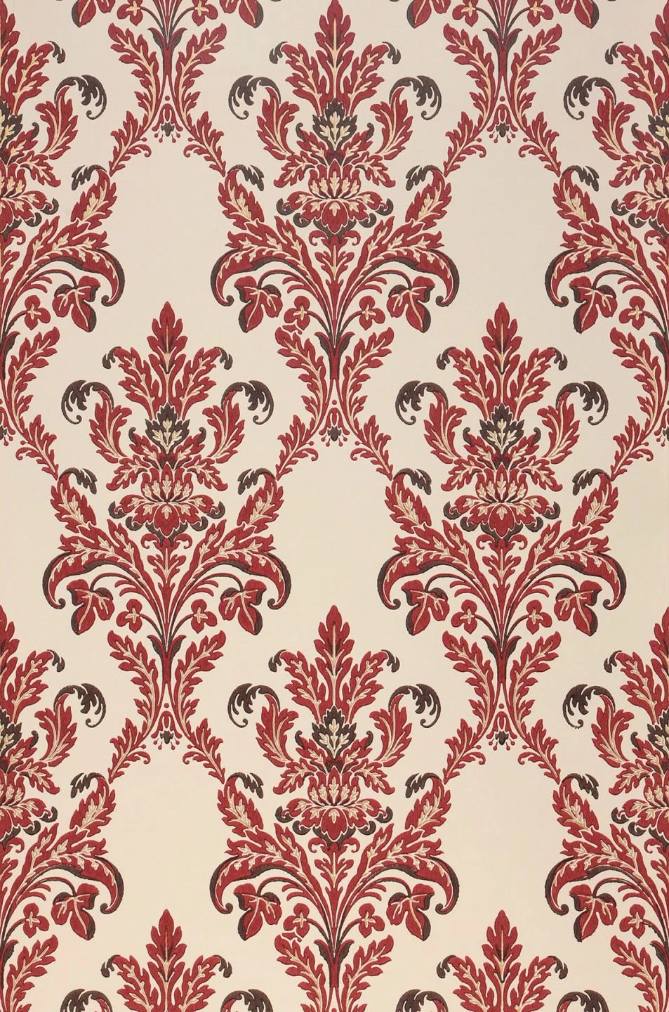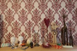 Kostbar und festlich kommt die barock gemusterte Papiertapete Georgina daher. Der Kontrast zwischen dem cremeweißen Grund und den Ornamenten in Purpurrot und Brauntönen lässt die stilisierten Blumen und Blattranken, die symmetrisch angeordnet sind, besonders schön hervortreten. Die unverwechselbare Optik des Leimdruckverfahrens, mit dem die Farben aufgetragen wurden, unterstreicht den klassischen Charakter von Georgina.