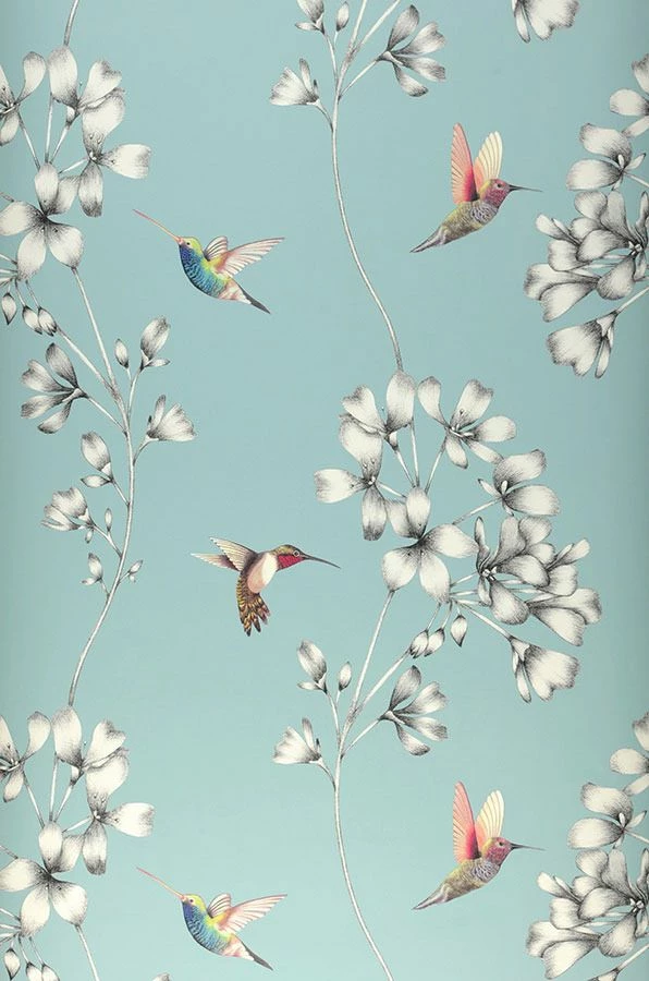 Kolibris umschwirren Blüten – und durch die schwarzweiße Zartheit der Blüten werden die bunten Farben der Kolibris besonders betont. Der pastelltürkise Untergrund lässt sich durch Möbel oder Wandfarben im selben Farbton harmonisch in das Interieur einfügen oder durch Creme- und Schlammfarben in den Mittelpunkt rücken. In jedem Fall entsteht ein geschmackvoller, sommerlich-leichter Raumeindruck.