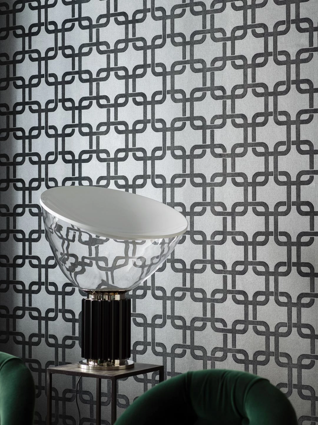 Spaciges Retro Design in Silbergrau und Schwarzgrau zum Anfassen schön – Die in sich verketteten Quadrate heben sich durch die Beflockung mit kurzen Textilfasern samtig weich vom schimmernden Untergrund ab. Das erzeugt nicht nur plastische Tiefe, sondern auch ein wohliges haptisches Gefühl. Genießen Sie Vintage-Charme mit allen Sinnen!