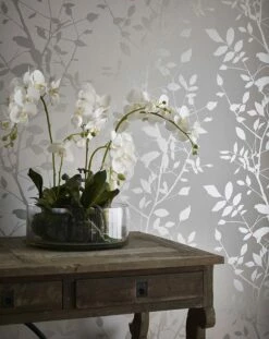Ein wunderschöner Name für die Luxus Tapete mit üppigen Blätterranken, die den Raum wahrhaftig in Glanz und Gloria hüllen. Dafür sorgt das in Silber schimmernde Muster auf mattem Untergrund in Grauweiss. Das perfekte Understatement für Gestaltungsideen mit romantischer Ader und effektvoller Noblesse.