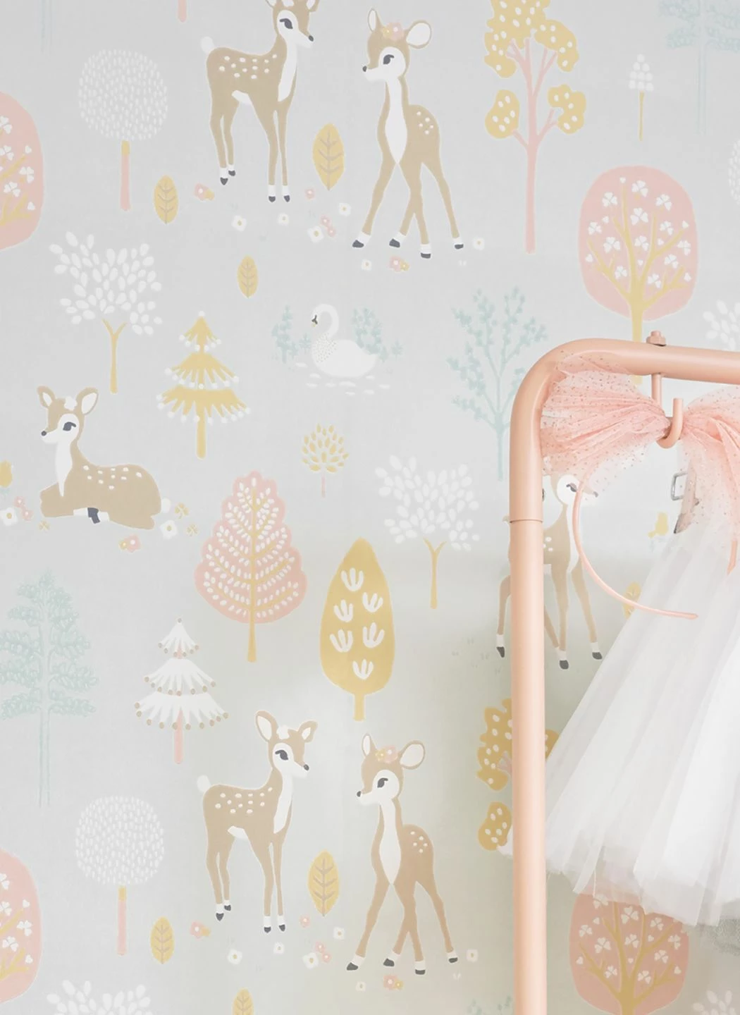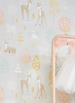 Rehkitze und Schwäne finden sich zwischen zart pastellfarben blühenden Bäumen wie in einem lichtdurchfluteten Wald. Die Welt, die die Vliestapete von Majvillan in das Zimmer Ihres Kindes bringt, ist friedlich und voller Geborgenheit. Die hochwertige Tapete wurde im traditionellen Leimdruckverfahren hergestellt und lässt sich wunderbar mit hellen Möbeln in den passenden Farben kombinieren.
