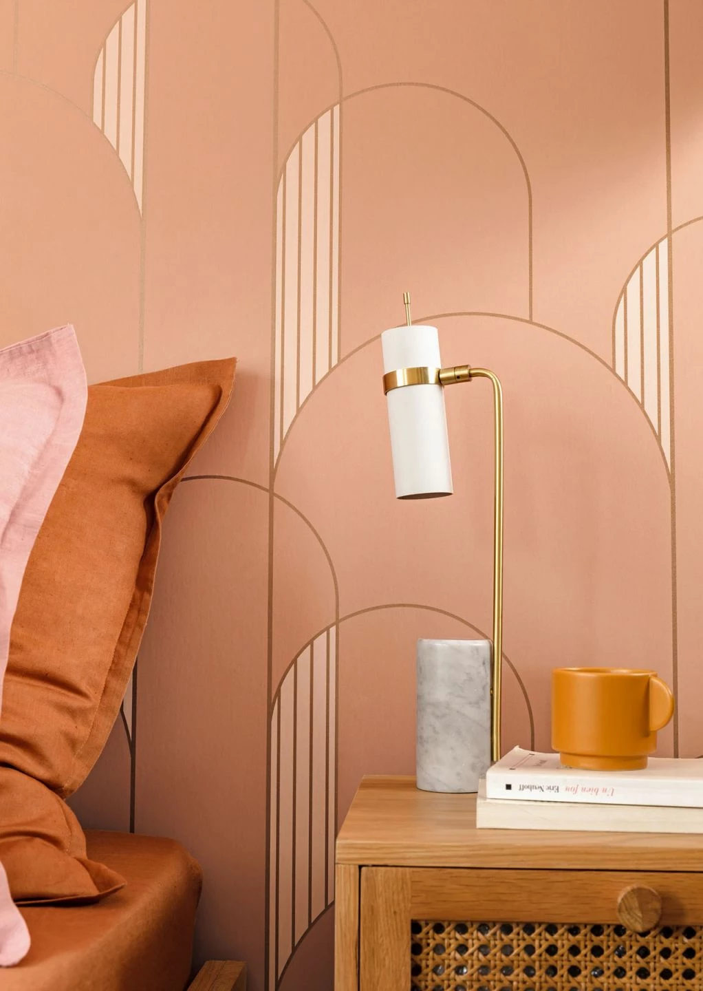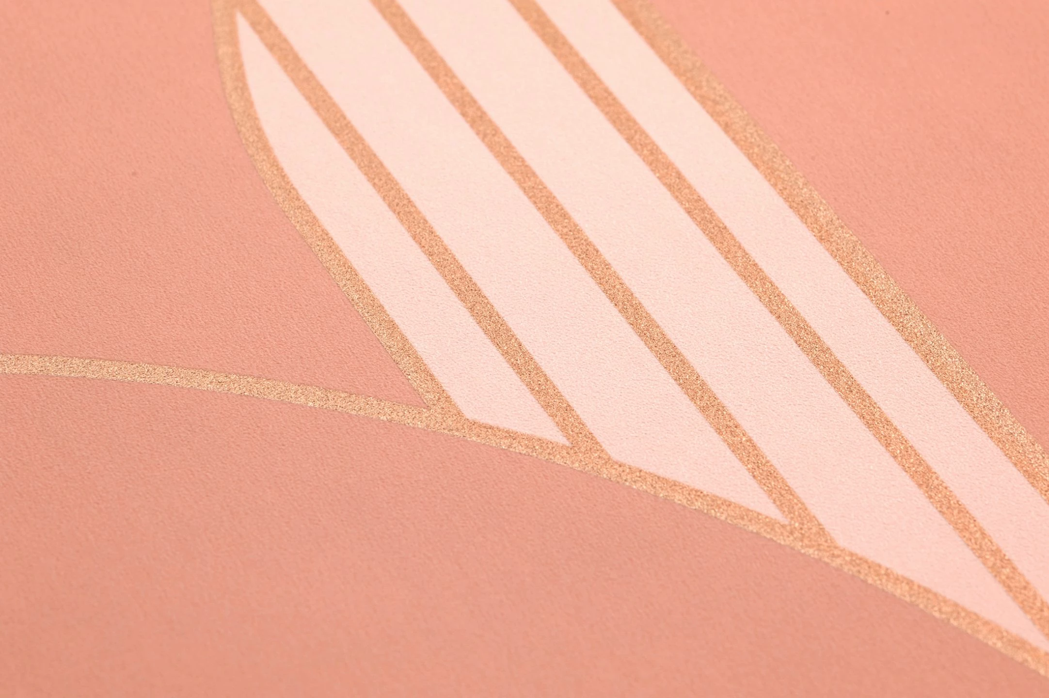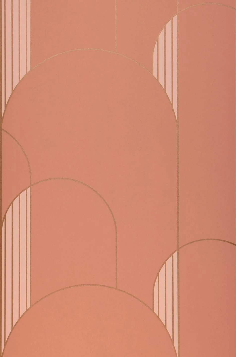 Die Farbe kostbaren Rosenholzes formt in Verbindung mit zartem Rosa und schimmernden bronzefarbenen Linien einander überlappende, klar definierte Bögen und greift so Elemente des Art Deco auf. Durch die Überlappungen entsteht eine Ahnung von räumlicher Tiefe. Kombiniert mit Weiß, Cremefarben oder passenden Holztönen bildet die Tapete eine geschmackvolle Kulisse für ein freundliches Wohnzimmer, ein behagliches Schlafzimmer oder – dank ihrer Vinyloberfläche – ein elegantes Bad.
