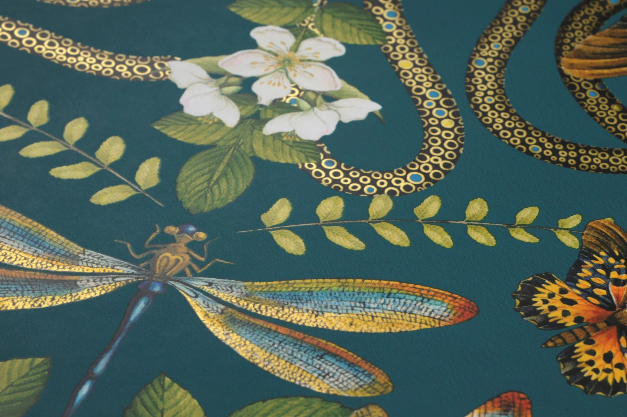 Wie beim Blick durch ein Kaleidoskop sind prachtvolle Schmetterlinge, sich ringelnde Schlangen und schlanke Libellen zusammen mit Blüten und Blättern zu einem faszinierenden Muster angeordnet. Die naturgetreue Darstellung der Einzelheiten eröffnet ein Spannungsfeld zu dem kunstvollen Arrangement. Der wasserblaue Grund strahlt Tiefe aus und bildet eine schöne Kulisse für die leicht schimmernden Musterfarben.