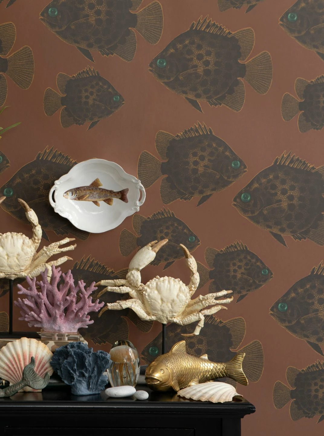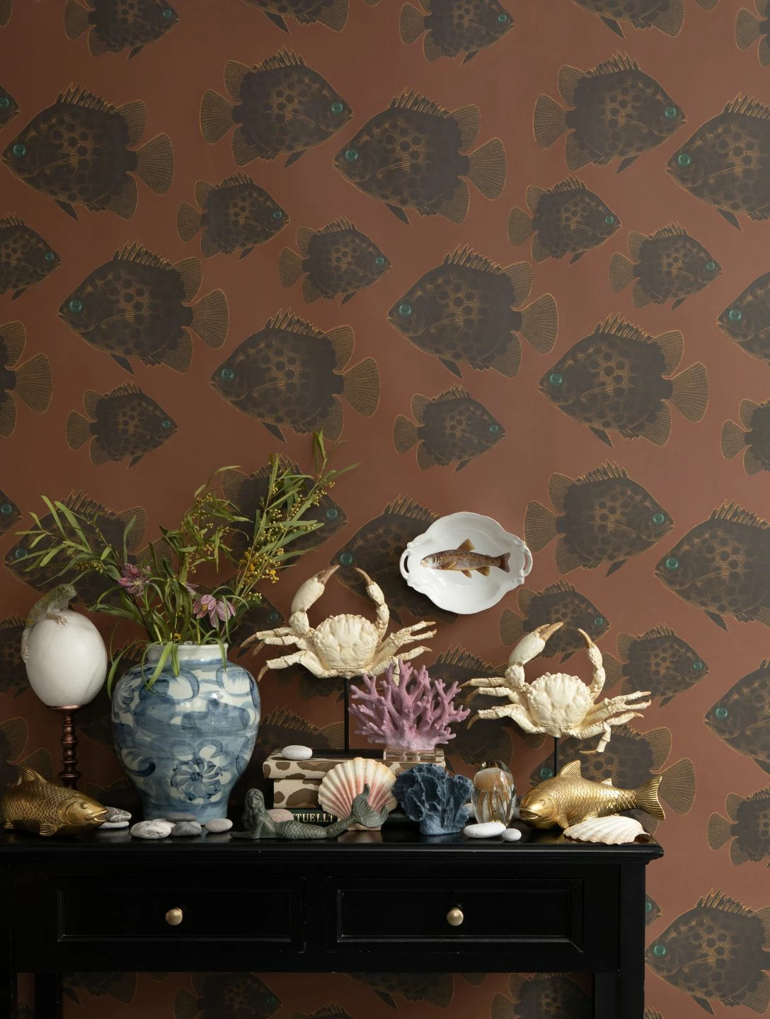 Das ausgefallene Design von Lisa Bengtsson konzentriert sich ganz auf warme, dunkle Brauntöne, die einen engen Zusammenhalt zwischen den Fischen des Musters und dem Untergrund herstellen. Dazwischen leuchten die grünen Augen der Fische hervor und lenken die Blicke auf sich. In der Balance zwischen Naturnähe und Stilisierung kreiert Vliestapete Hakan einen individuellen, gemütlichen Raum der Geborgenheit – nicht nur für Hobbyangler.