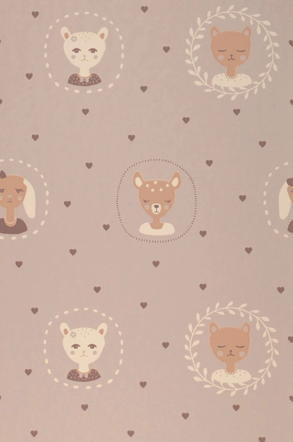 Niedliche Tiergesichter, liebevoll gezeichnet wie in einem Bilderbuch und umrahmt von zart gemusterten Borten, machen das Kinderzimmer zu einem freundlichen Ort der Geborgenheit. Der hellgrauviolette Grund der im Leimdruckverfahren hergestellten Vliestapete von Majvillan ist durch unzählige kleine Herzen belebt. Das Design beschränkt sich auf wenige Farbtöne wie Braunbeige, Cremeweiß und Schokoladenbraun und kreiert mit dem Hellgrauviolett des Grunds eine harmonische Kulisse.