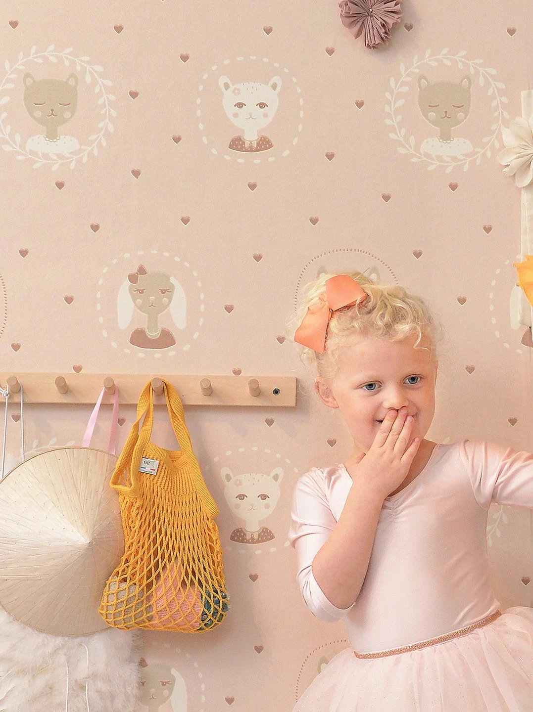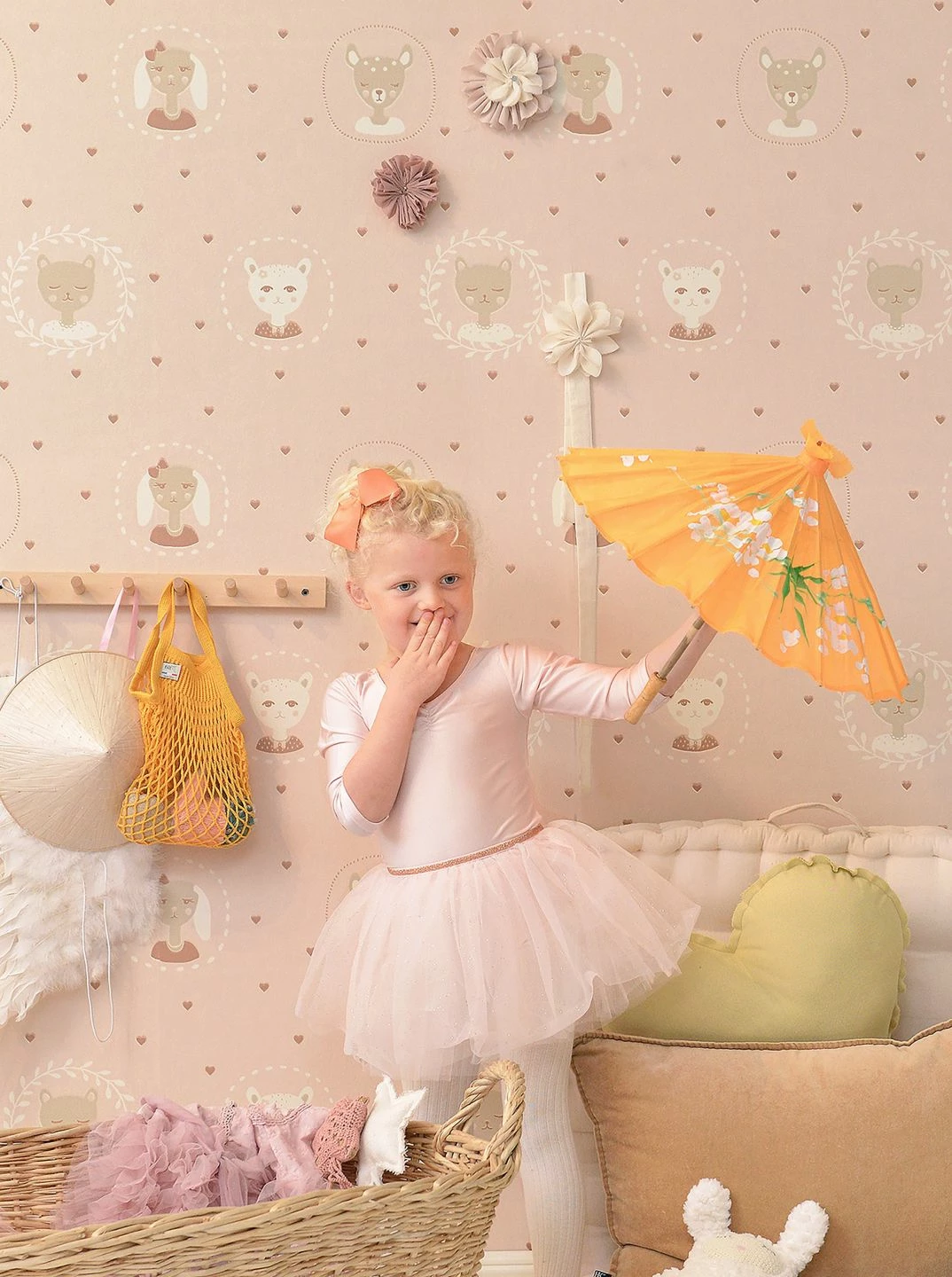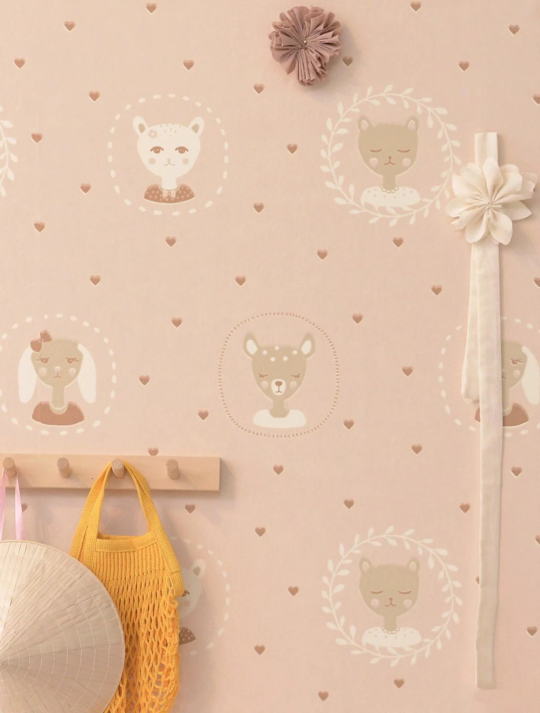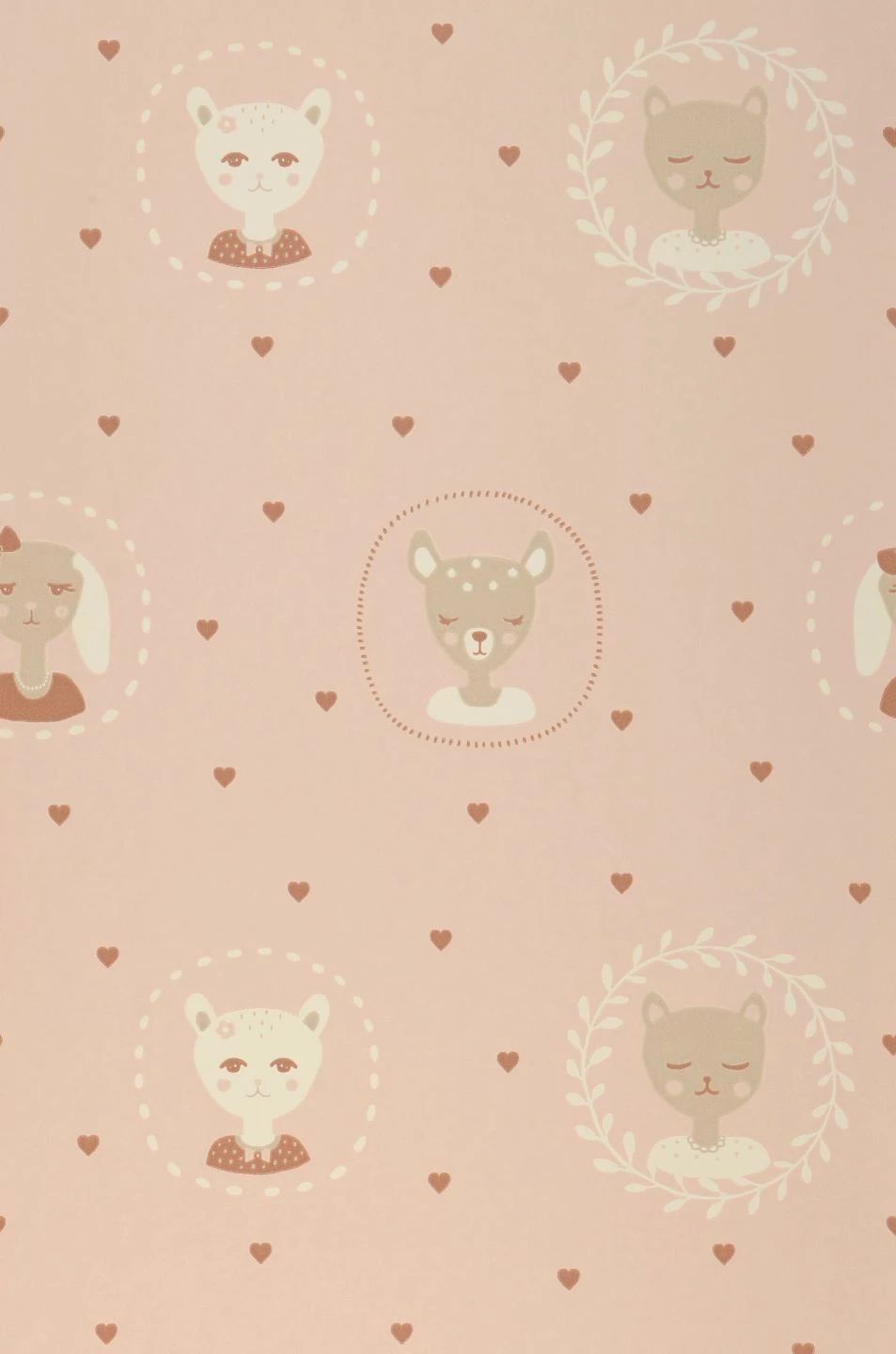 Freundliche Gesichter von Kätzchen, Rehkitzen und Hunden mit Schlappohren blicken von der Kinderzimmertapete „Hearts“ herab. Den zart roséfarbenen Untergrund lockern kleine Herzen auf. Die im Leimdruckverfahren hergestellte Vliestapete des schwedischen Herstellers Majvillan schafft eine freundliche, spielerisch-leichte Atmosphäre im Kinderzimmer, in der sich Ihr Kind pudelwohl fühlen kann.