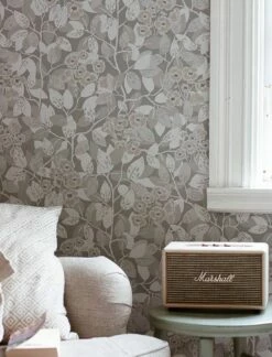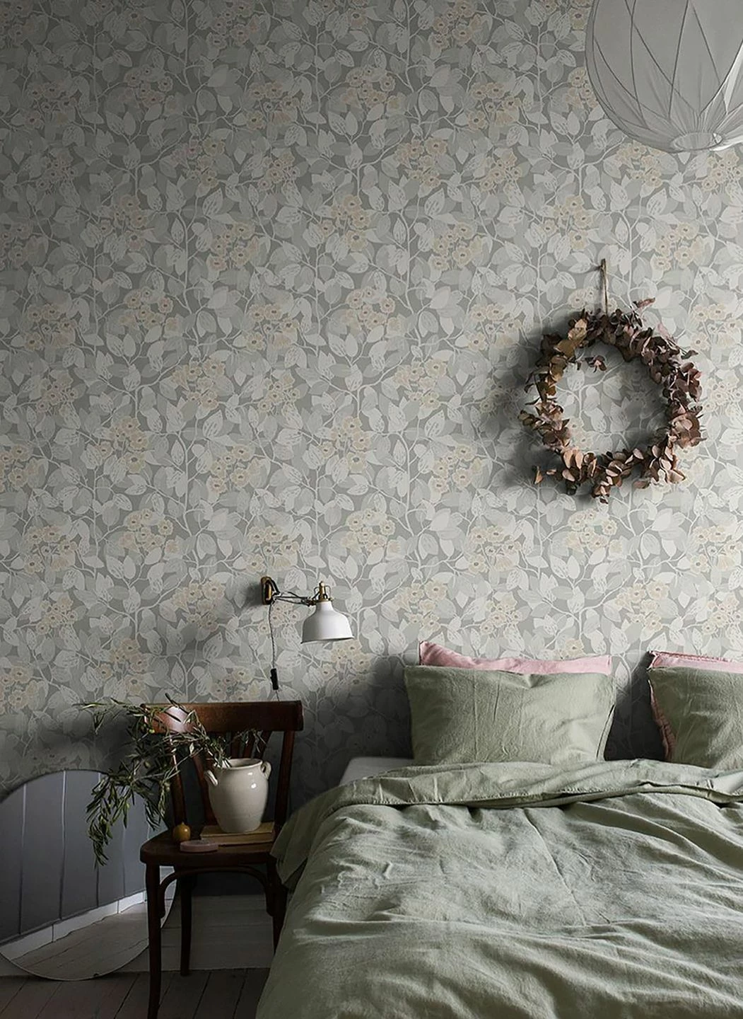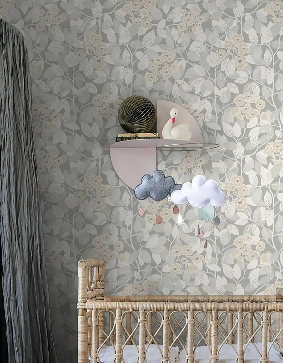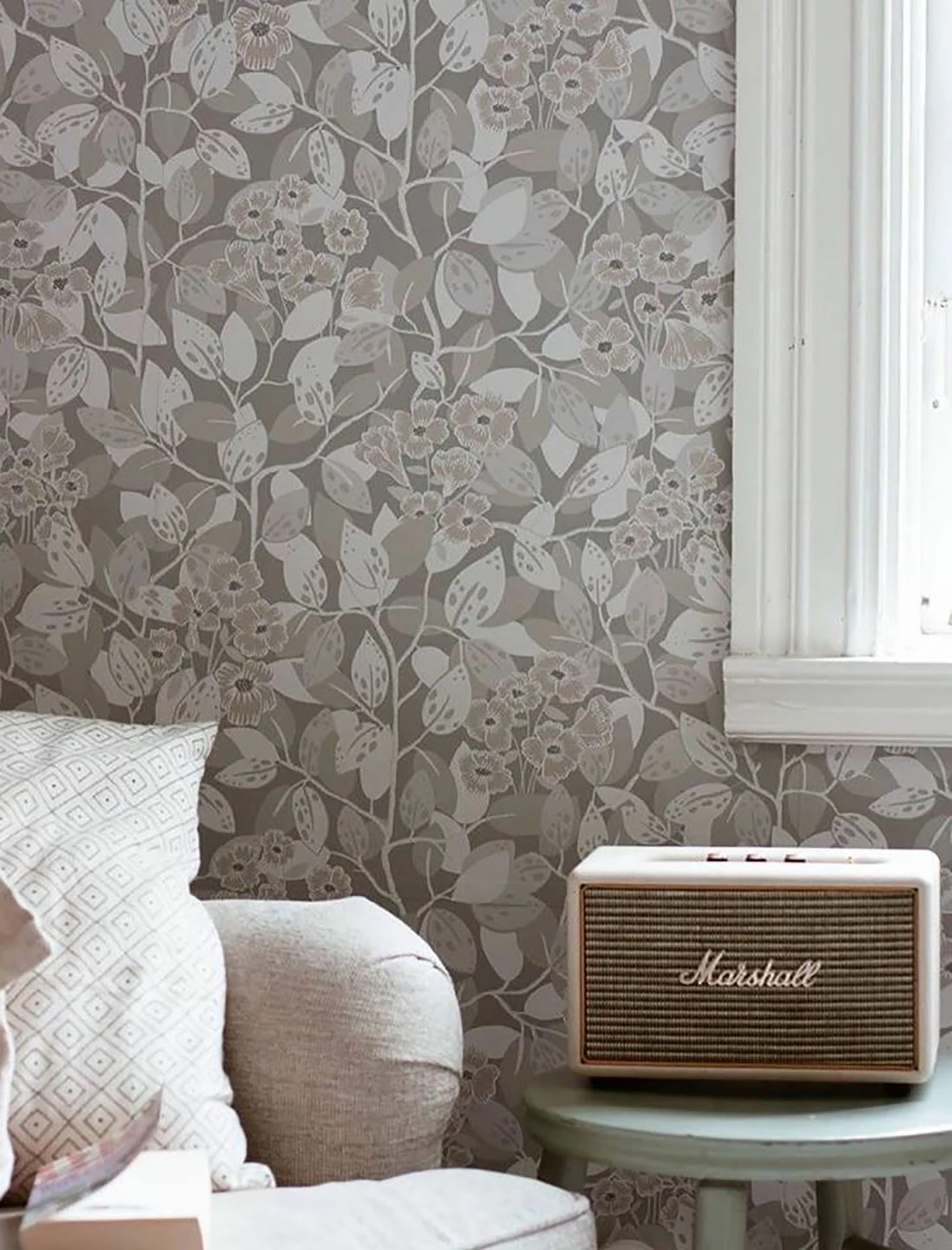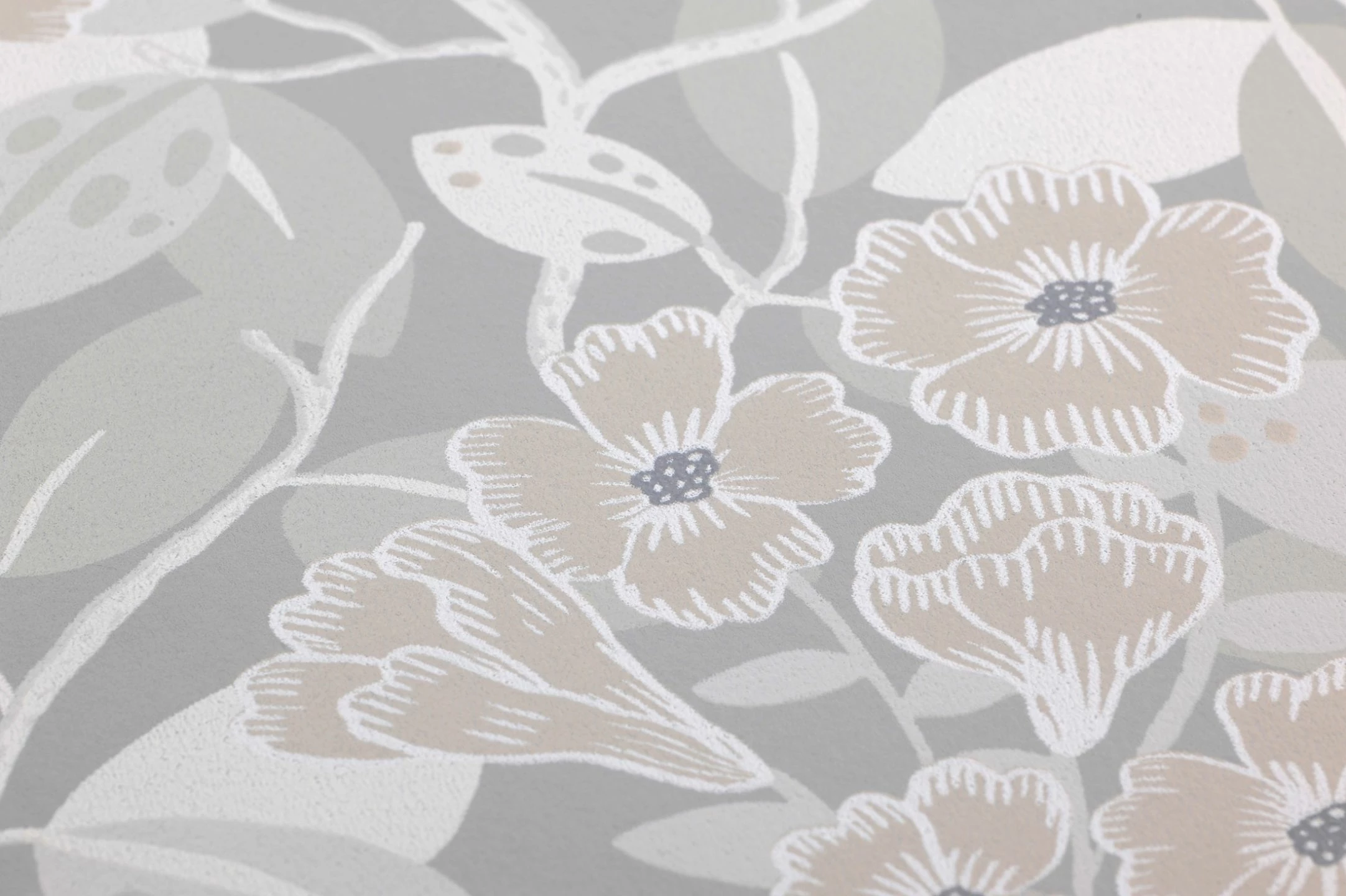 Ihre außergewöhnliche Farbgebung macht den besonderen Charakter dieser Vliestapete aus: Graubeige, grauweiß und hellgrau auf einem grauen Hintergrund sind die Blätter und Blüten, die sie über und über bedecken. Durch die Farbgebung rein aus verschiedenen Schattierungen von Grau wirkt das florale Muster wie eine kostbare, künstlerische Schwarzweißaufnahme. In Verbindung mit Weiß, aber auch mit schwarzen Einrichtungselementen entfaltet es seine ganze Eleganz.