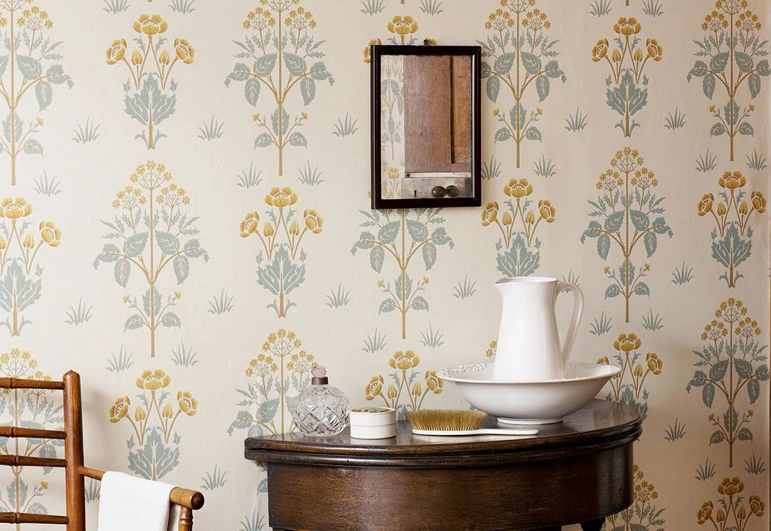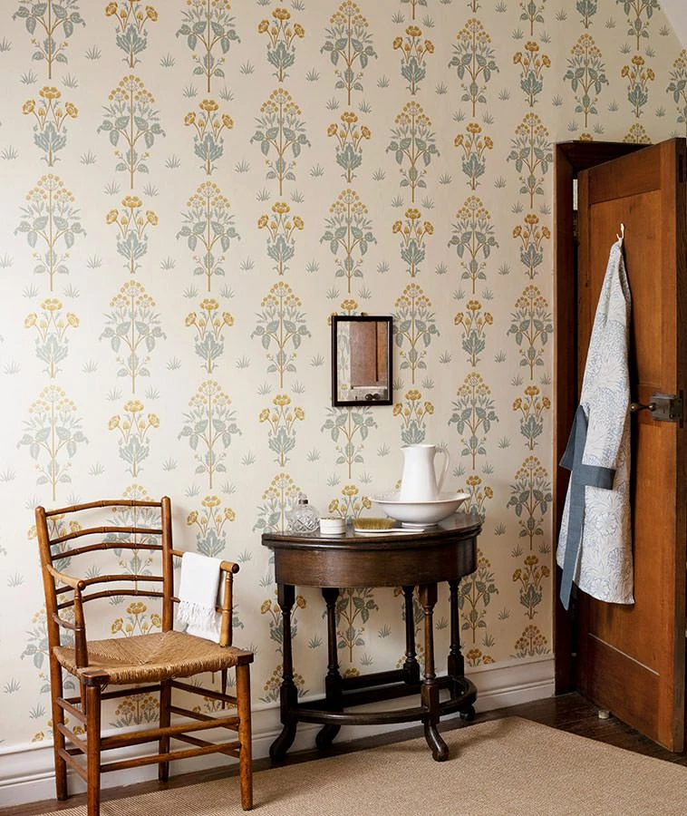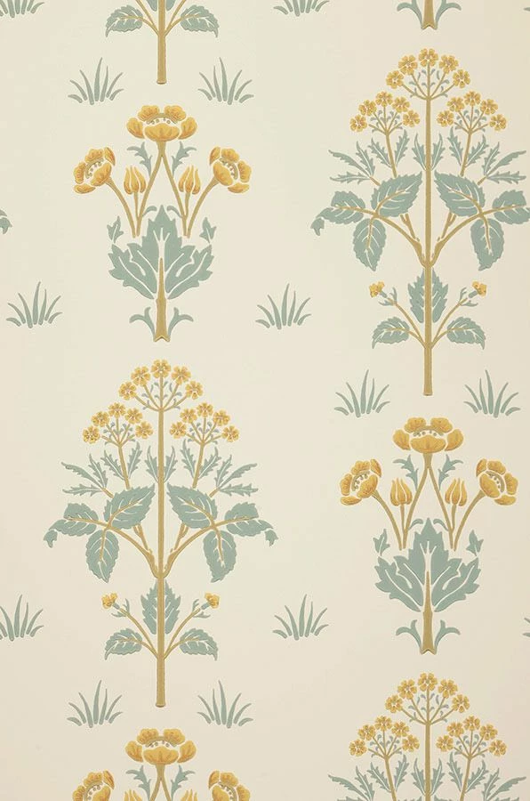 Stilisierte Pflanzen im Jugendstil finden sich auf dieser Papiertapete von Morris & Co. in einer präzisen symmetrischen Anordnung. Auf dem cremeweißen Untergrund bilden die Blüten und Stiele in Beige- und Gelbtönen und die olivgrünen Blätter eine harmonische Einheit. Die Tapete bietet einen angenehmen Kontrast beispielsweise zu britischen Möbeln aus dunklem Holz und unterstreicht deren antiken Eindruck.