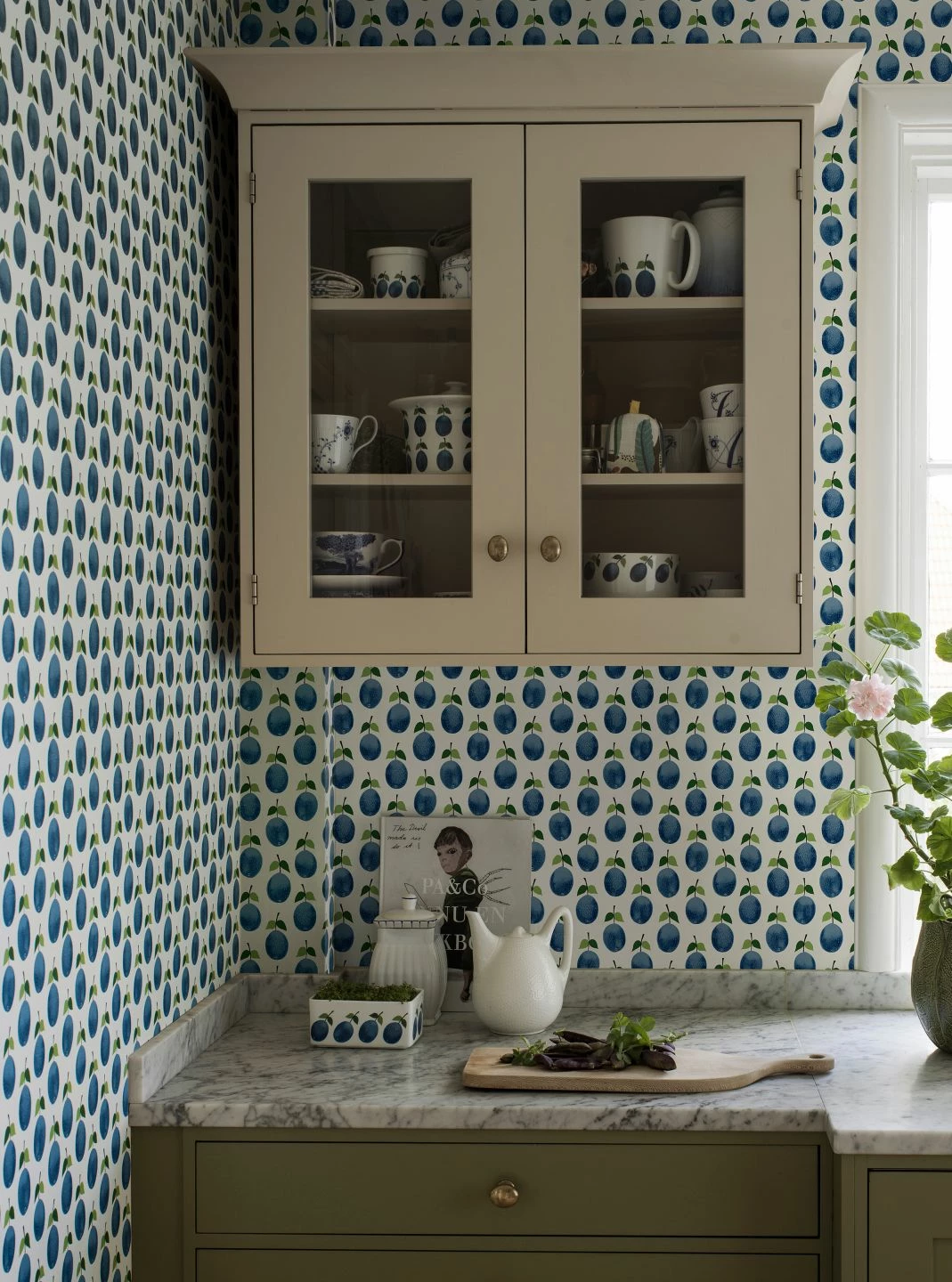 Tiefblaue Pflaumen in Hülle und Fülle erzählen von der Erntezeit des Spätsommers. Das Brillantblau der reifen Früchte und die Grüntöne der Blätter auf dem weißen Grund der Vliestapete eignen sich besonders für eine freundliche, einladende Küche als Mittelpunkt Ihres Familienlebens. Helle Oberflächen ergänzen das Muster der Tapete perfekt und schaffen einen gastfreundlichen Raum. „Henriette“ passt bestens zum skandinavischen Einrichtungsstil.
