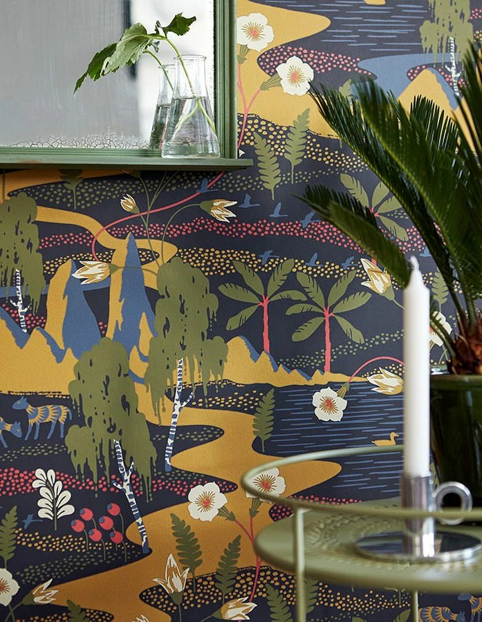 Auf Reisen gehen, ist mit Design Tapete Hesperia nicht schwer. Tiefe Täler, hohe Berge, tropische Kokospalmen, kleine Seen und blühende Landschaften warten darauf, den Raum zu füllen. Das eindrucksvolle Motivmuster in kontrastreichen Farben wirkt kunstvoll abstrakt und erschafft für das Auge eine dynamische Struktur.