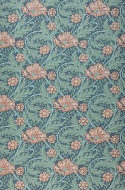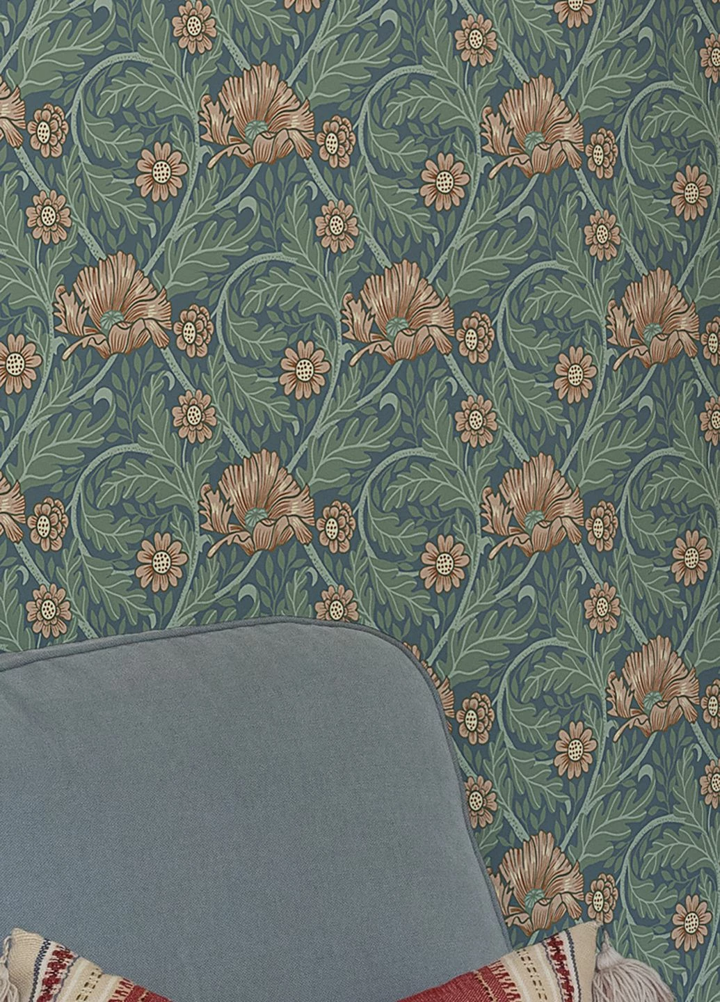 Zwischen dem Pastelltürkis und Schilfgrün der verschlungenen Blattranken, die mit dem blaugrauen Grund eine ästhetische Einheit bilden, kommen die großen Mohnblüten in Dunkelbraun und Hellrosa sowie die kleineren Blümchen besonders schön zur Geltung. Das Design folgt mit seiner klassischen Anordnung und der typischen Farbgebung der Tradition des englischen Tapetendesigns von William Morris und seinen Zeitgenossen im 19. Jahrhundert.