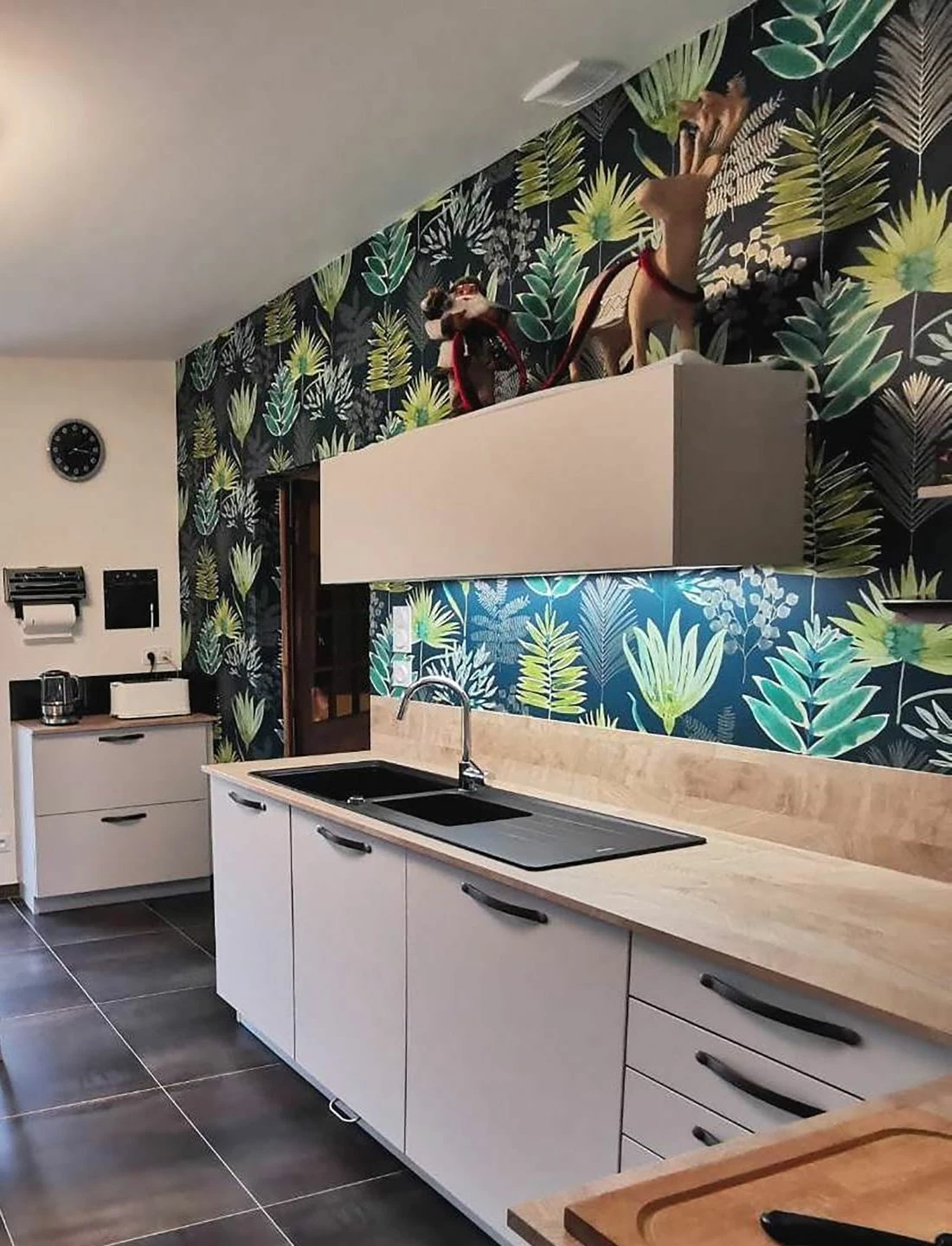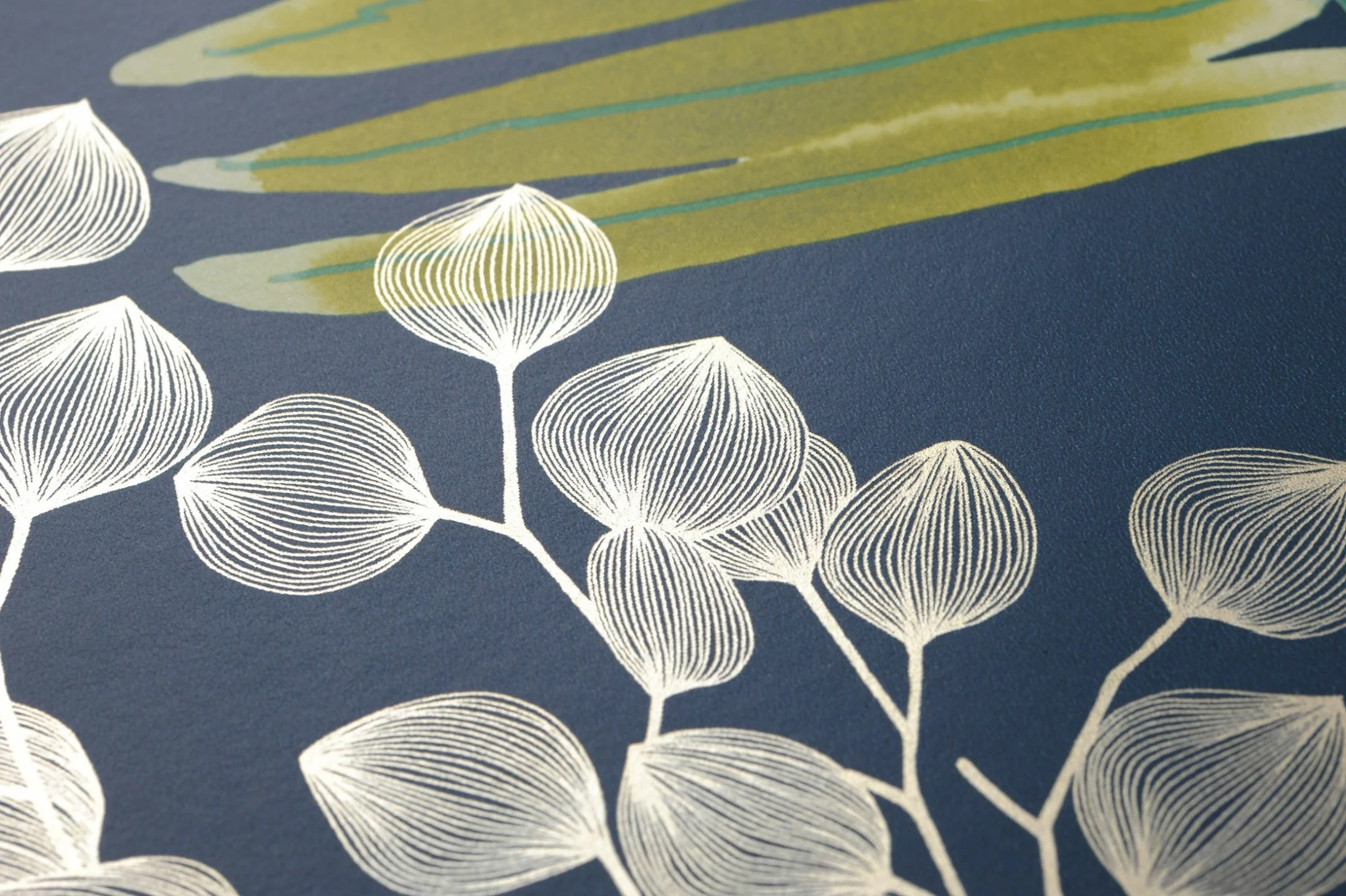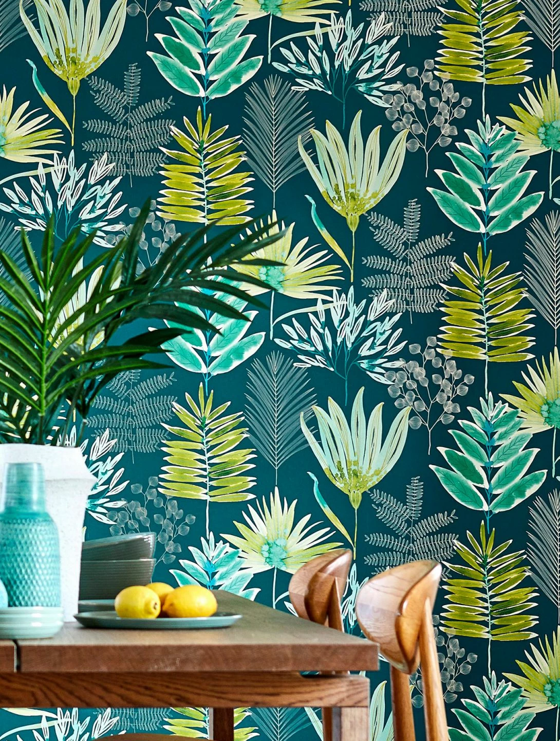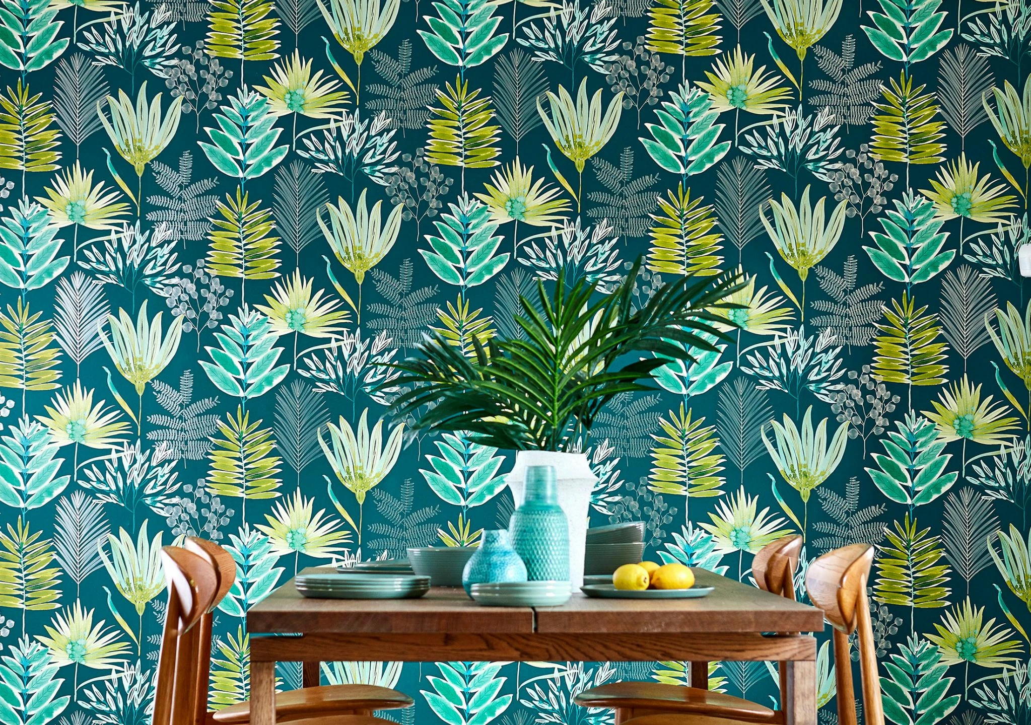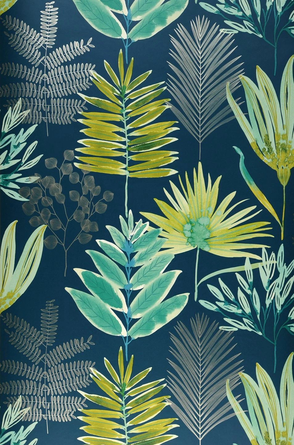 Farngrün, Grüngelb, Perlbeige, Türkisgrün, Weissgrün in Verbindung mit tiefem Ozeanblau verleihen dem floralen Tapetenmuster aus Farnblättern und reizvollen Blüten eine intensive Aura. Die Design Tapete wird zum leisen Kommunikationspartner, sie lenkt gerne ab vom stressigen Alltag. Der „grüne“ Charakter füllt den Raum mit natürlicher Schönheit.