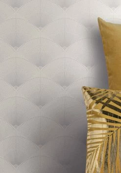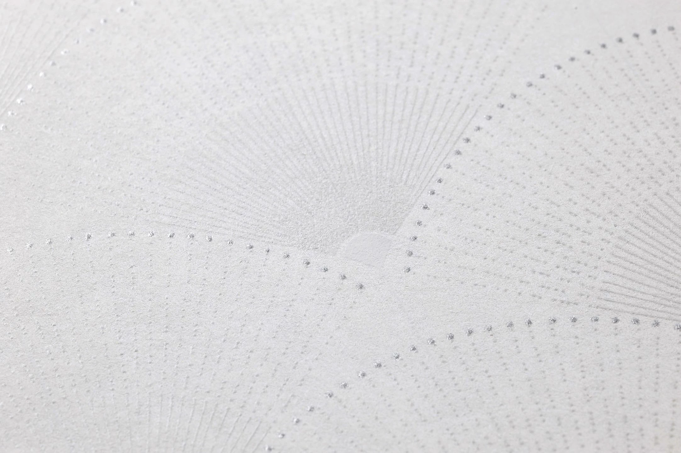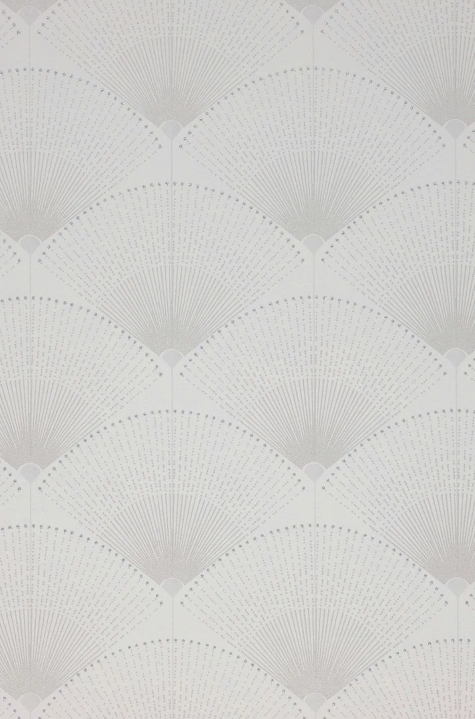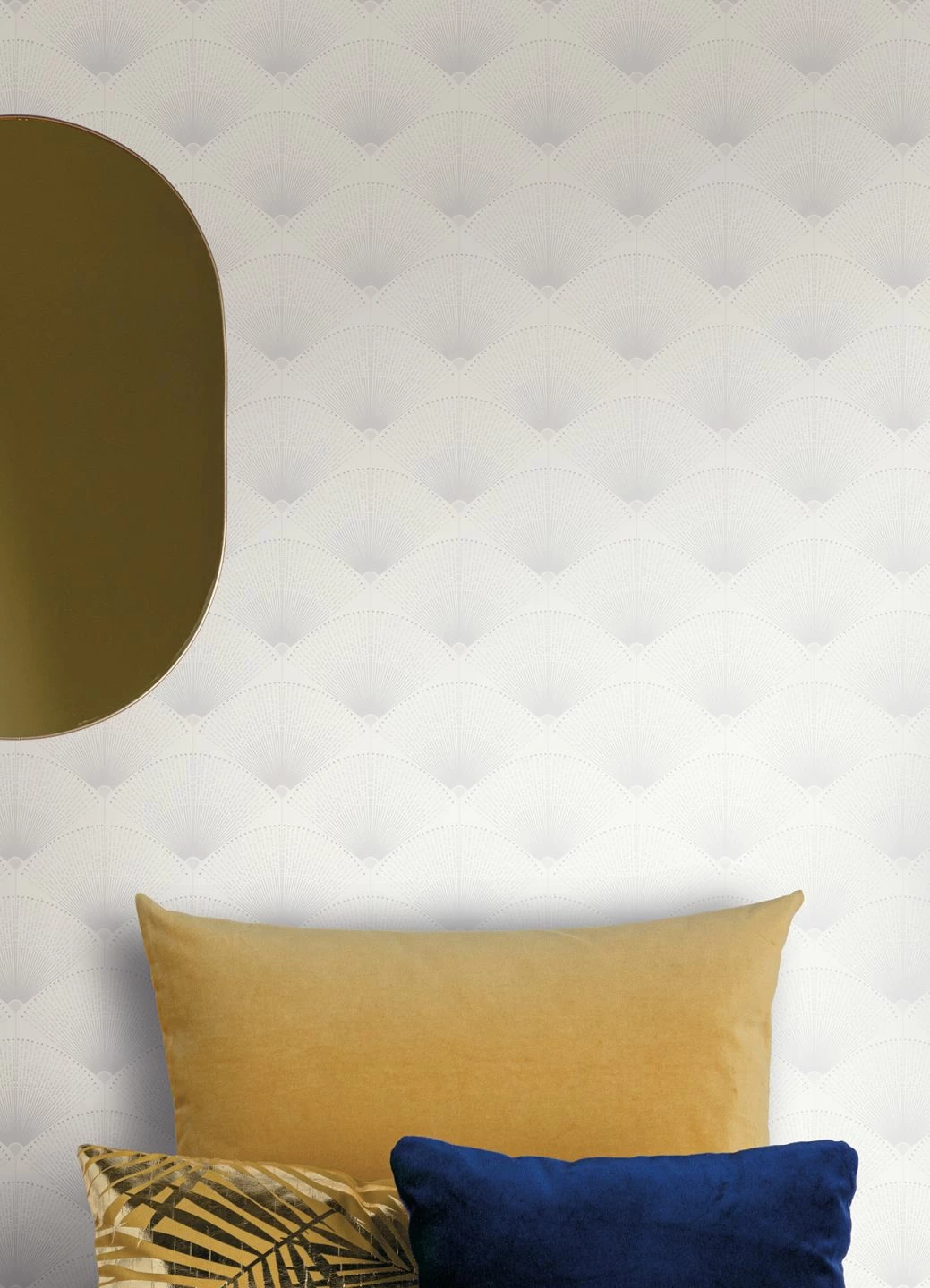 Ein Fächermuster, wie es für den Art-Deco-Stil typisch ist, ganz zart in Linien und Punkten aus hellen Grautönen auf den weißen Untergrund einer Vliestapete gedruckt: Das ist der Zauber der Art-Deco-Tapete „Hiromono“. Die silbernen Punkte, mit denen jeder Fächer endet, sind fühlbar erhaben auf die feine, fühlbare Struktur der Tapete getupft und liefern schimmernde Highlights. Die Tapete bietet einen zurückhaltenden, aber edlen Hintergrund für hochwertigen Retro-Stil.