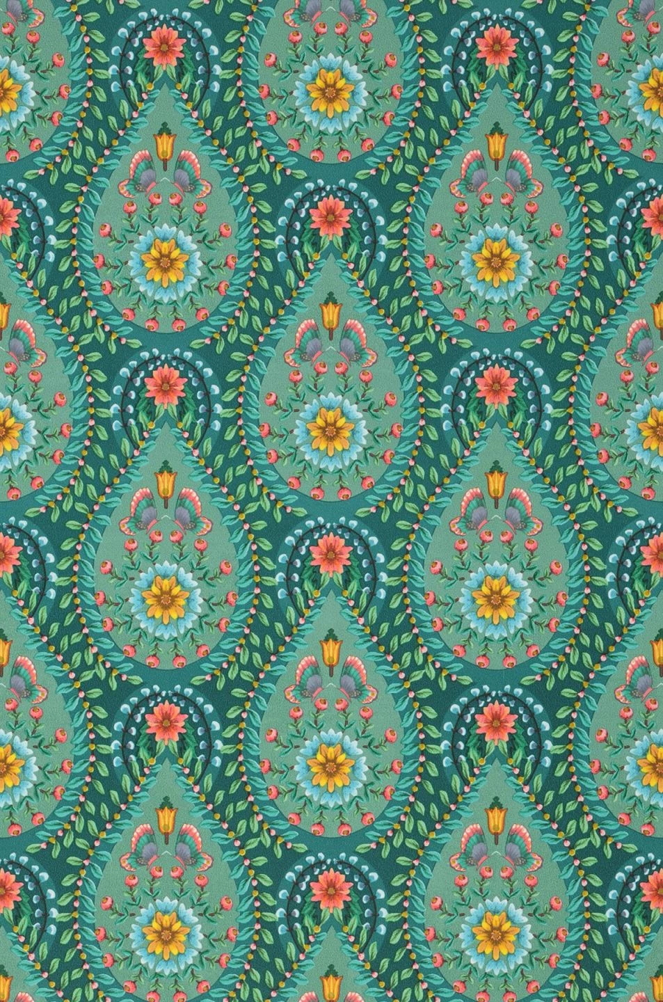 Märchenhafte Stimmung wie in einer Erzählung aus „1001 Nacht“ zaubert diese farbenfrohe Vliestapete. Aus verschiedenen kreisförmig angeordneten Blüten, Schmetterlingen und rankenden Zweigen entstehen dicht an dicht tropfenförmige Ornamente im orientalischen Stil. Die vorherrschenden Farben sind ruhige Grün- und Blaugrüntöne. Doch die Details in Hellblau, Rot und Sonnengelb sorgen für leuchtende Akzente.