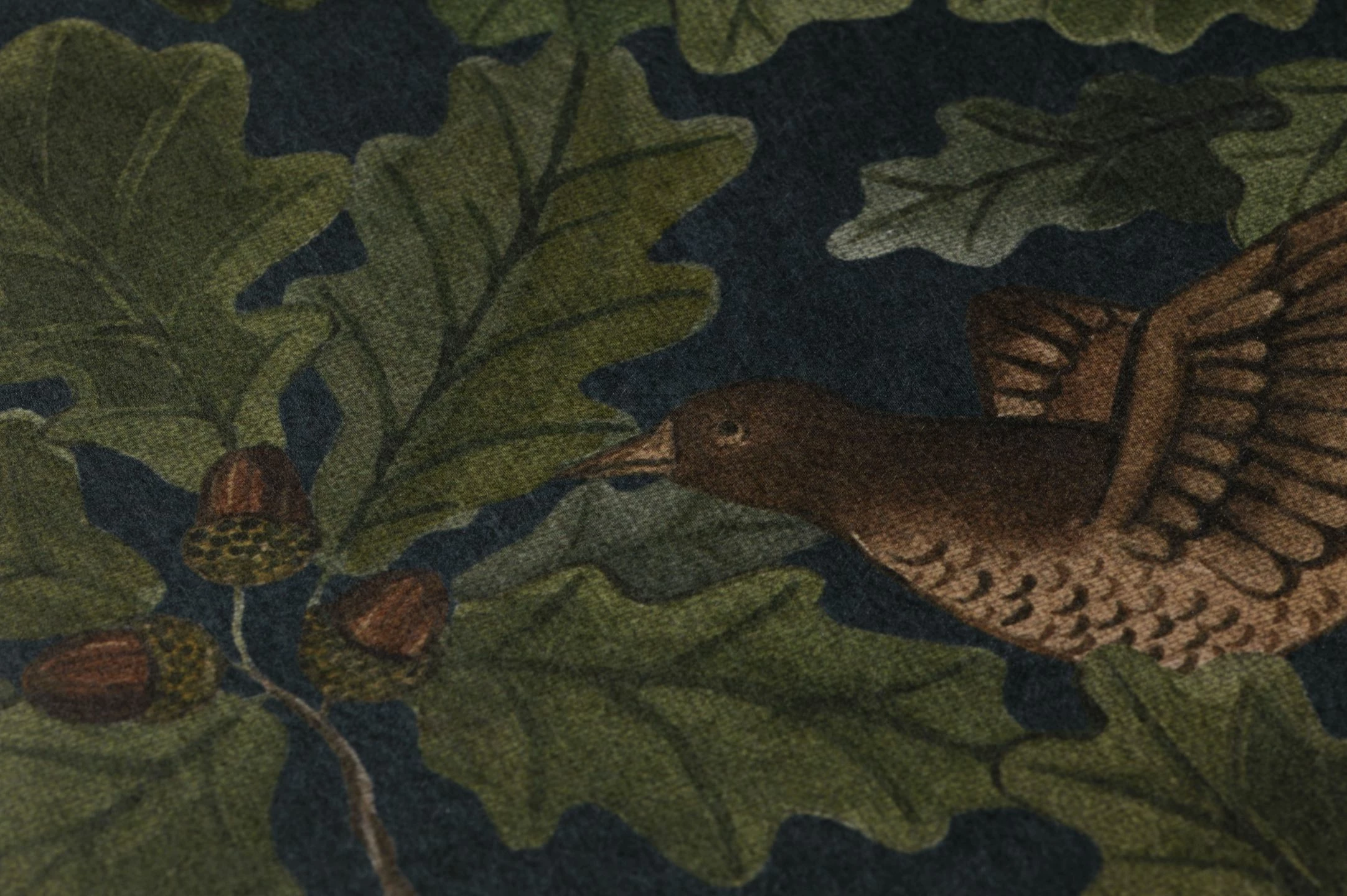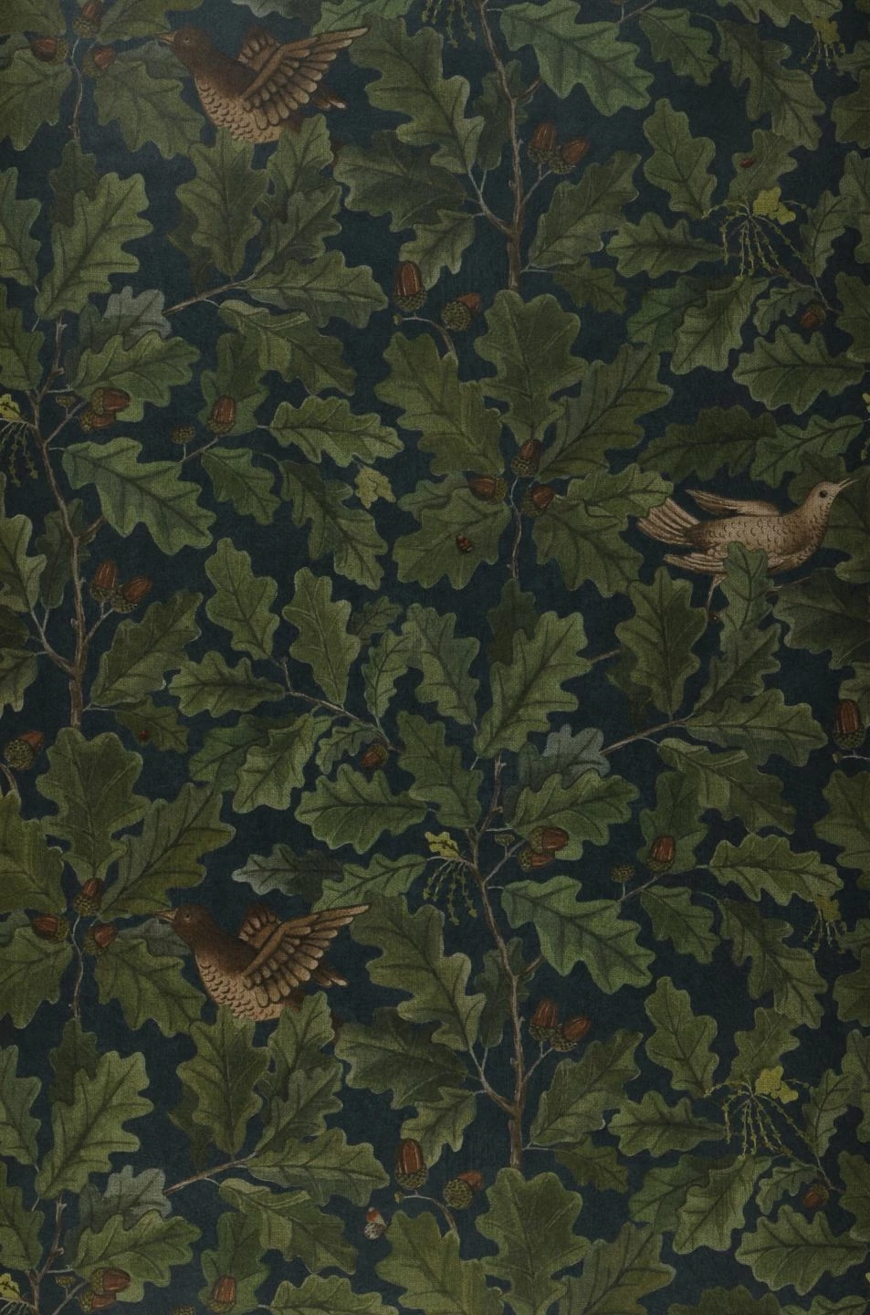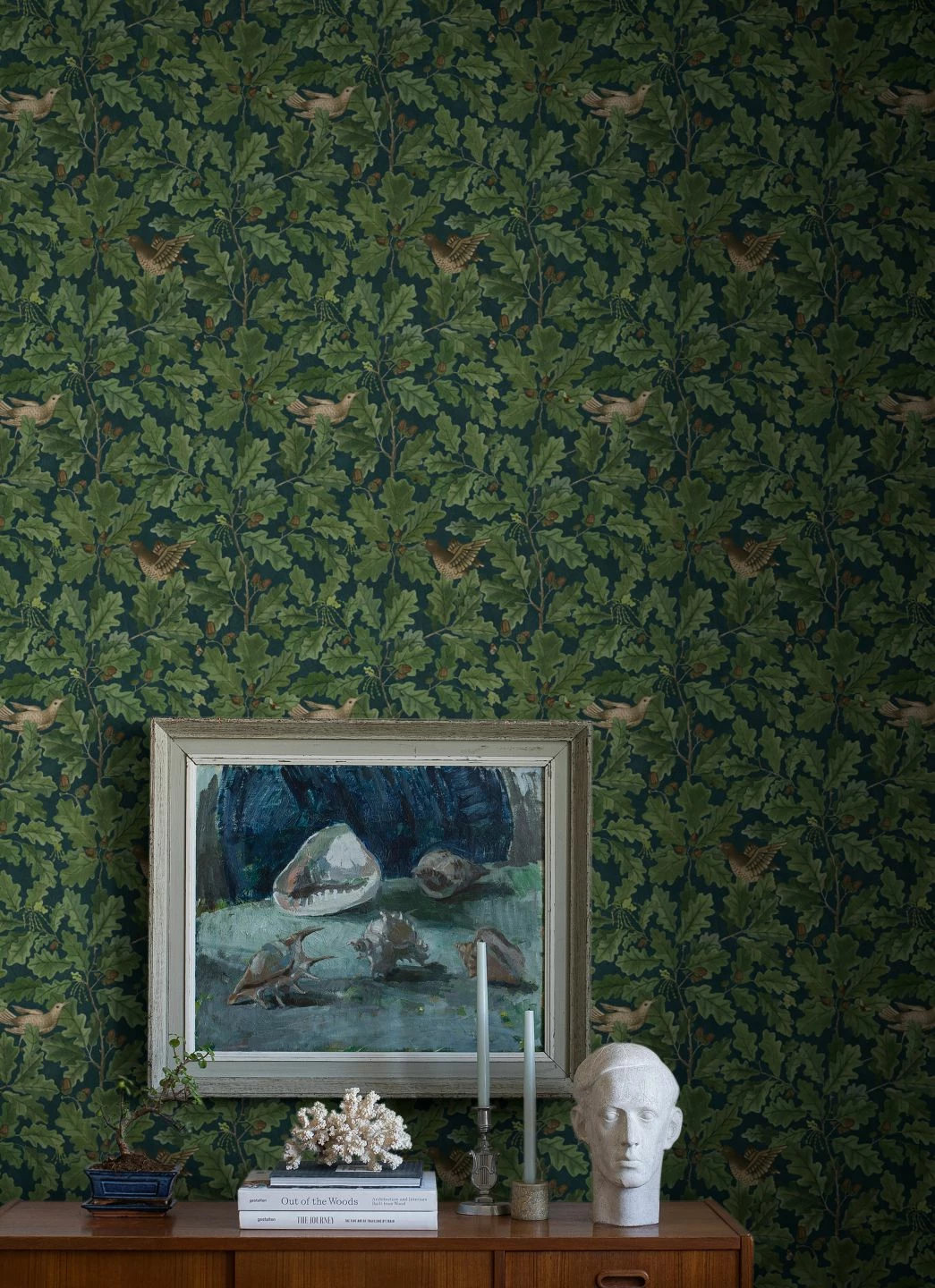 Kräftiges, satt grünes Eichenlaub bietet angenehmen Schutz vor zu viel sommerlicher Hitze – für Ihren gemütlichen Raum, aber ebenso für die Vögel und Insekten, die sich zwischen Blättern, Blüten und Eicheln inmitten der Zweige aufhalten. Die gedeckten Grün- und Brauntöne auf dem blaugrünen Grund zaubern eine ruhige Stimmung und passen ausgezeichnet zu Vintage-Einrichtungen oder dem skandinavischen Stil.