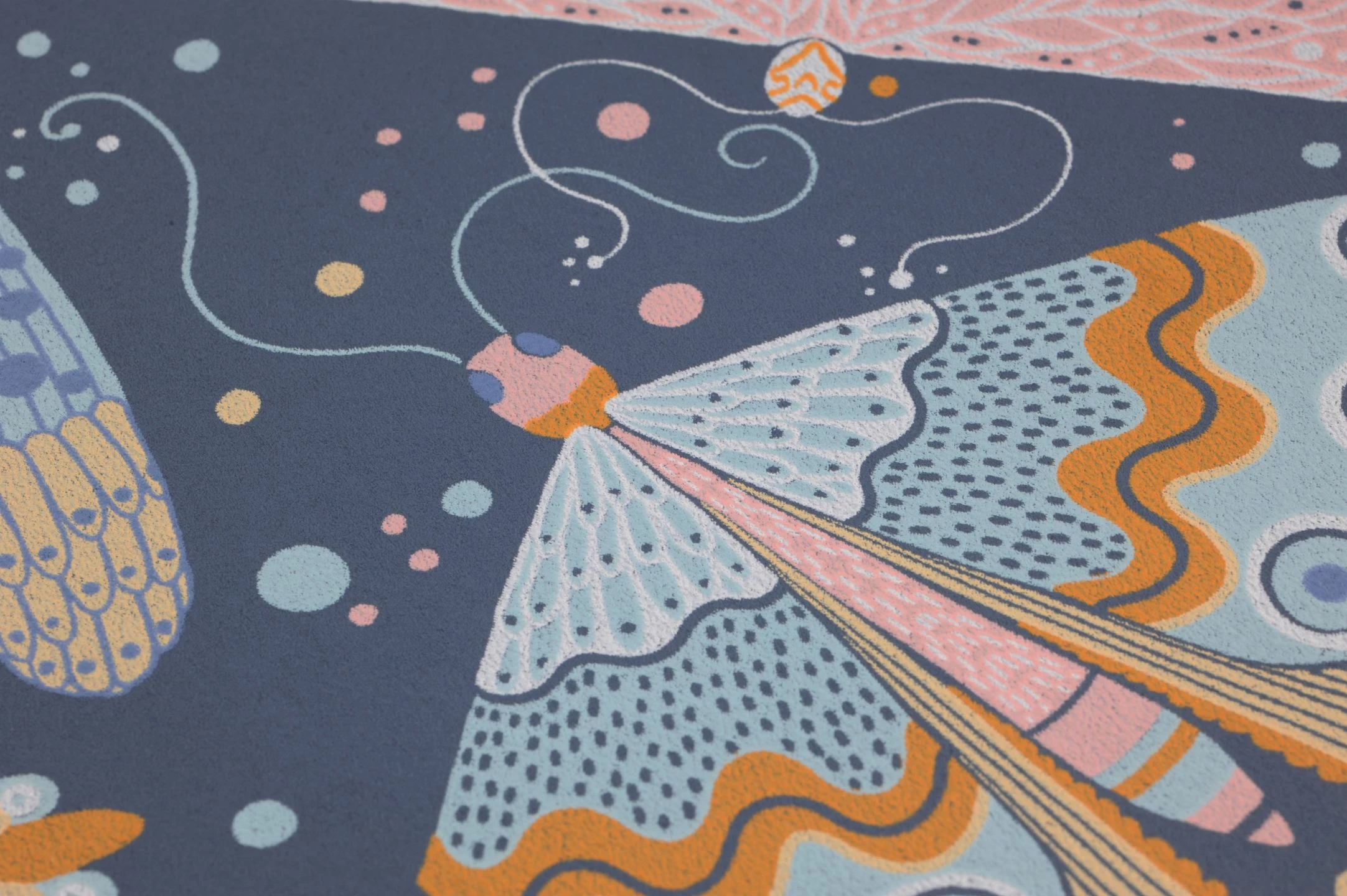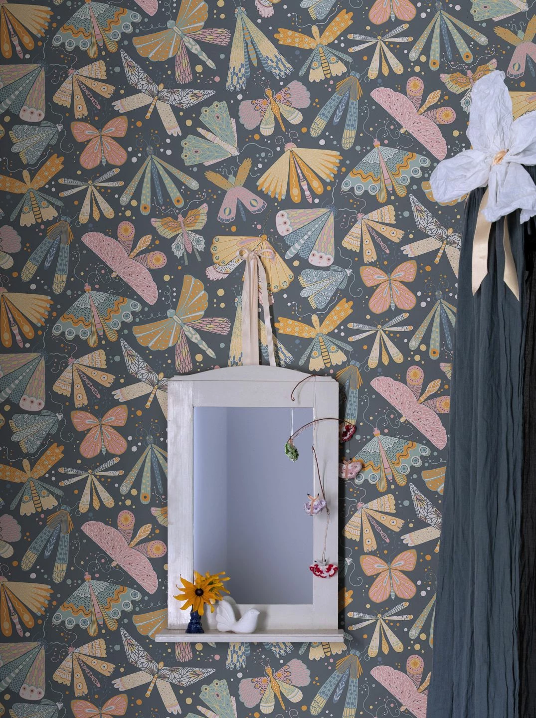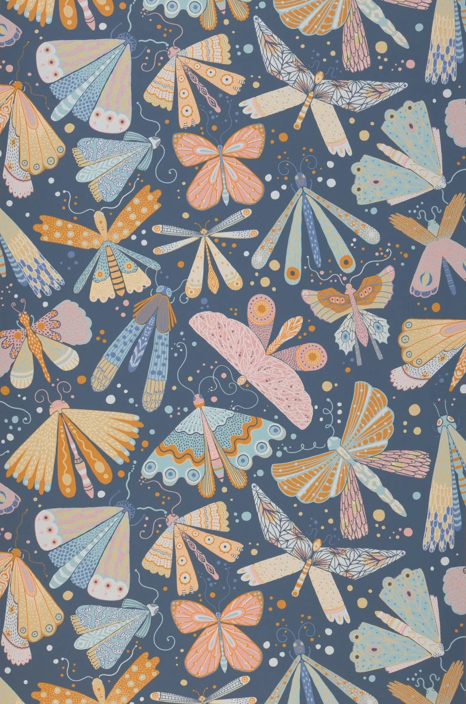 Stilisierte Falter und Schmetterlinge schmücken Tapete Ingrid in einer raffinierten Mischung aus warmen und kühlen Farbtönen, die allesamt perfekt zum skandinavischen Einrichtungsstil passen. Phantasievolle, abwechslungsreich gestaltete Flügelmuster machen jeden einzelnen Schmetterling zu einer Kostbarkeit. Wie Sterne am Abendhimmel beleben zusätzlich kleine Punkte in den Musterfarben den Gesamteindruck.