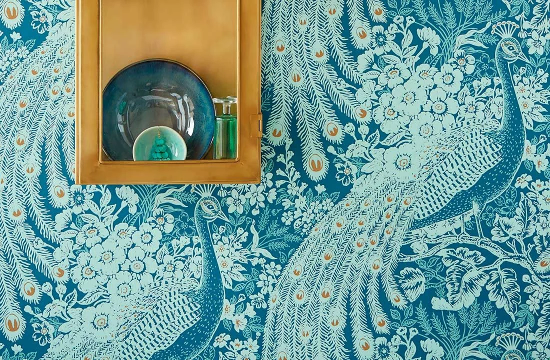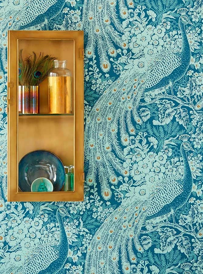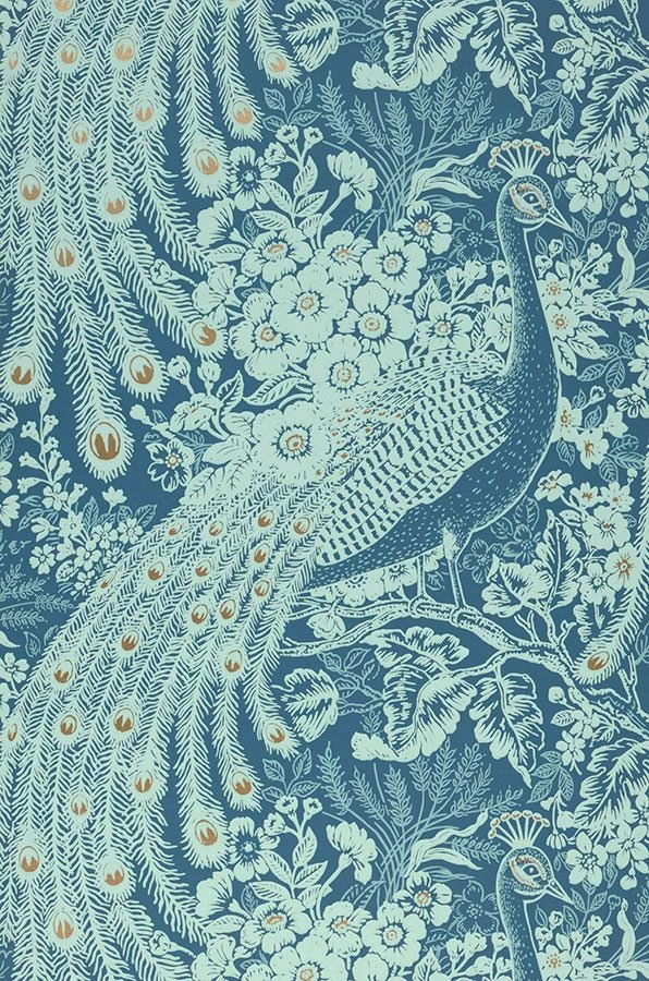 Der Blaue Pfau in einer interessanten Farbvariante – Die Effektfolie spielt mit Hell-/Dunkelkontrasten und der fantastischen Zusammensetzung aus Grünblau, Pastelltürkis, Perlgold und Weissgrün. So erscheint der stolze Vogel, der von Blättern, Blüten und Zweigen umrahmt wird, mit Abstand betrachtet als fantasievolles Jugendstilmuster, das an frischer Eleganz kaum zu überbieten ist.