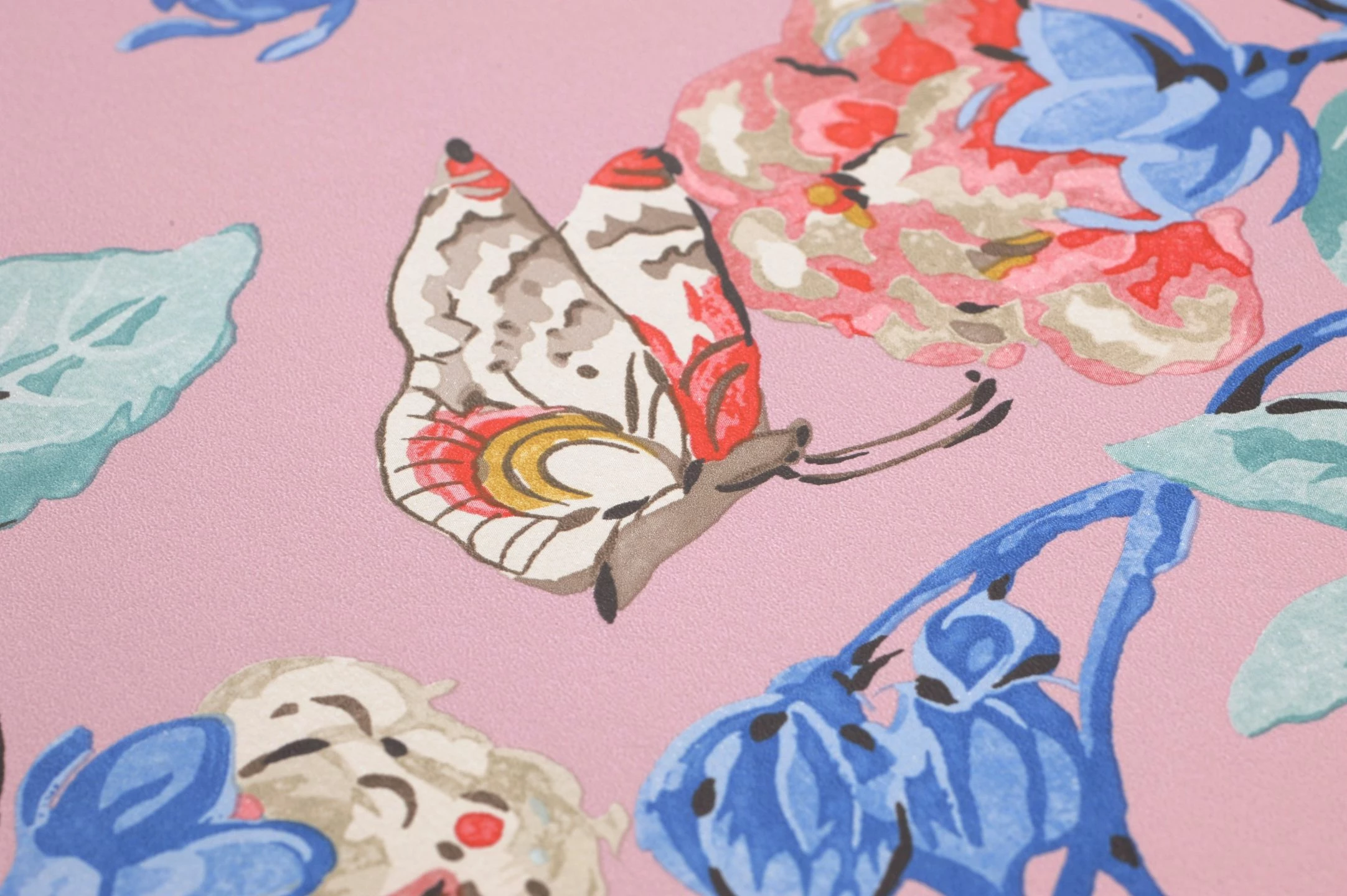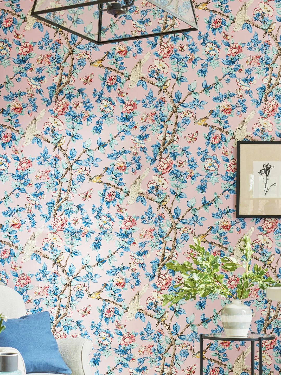 Poetisch und farbenfroh dekorieren Sie Ihren Raum mit der botanischen Tapete Jardine. Wie auf einem Gemälde im Stil der asiatischen Kunst wirken die Zweige voller Blätter in sanften Blautönen und Blüten in Perlweiß und Orientrot. Vögel mit buntem Gefieder und Schmetterlinge vervollkommnen das Bild. Mit schönen Details sind die Blüten, Blätter und die Flügel der Schmetterlinge versehen. Ein wahres Kunstwerk für Ihre Wände!