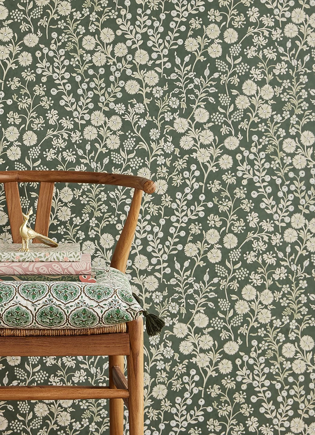 Das Blumenmuster der Vliestapete Jessica trifft die ideale Mischung aus modernem skandinavischen Design, ruhigen Farben und einem Hauch von nostalgischer Geborgenheit. Die hellen Umrisse der Blumen, Beeren und Blätter auf dem tannengrünen Grund wecken die Erinnerung an Sommerferien in Schweden zwischen Wäldern, Wiesen und Seen. Unbeschwertheit und ein wohliges Gefühl des Zuhauseseins durchströmen Ihr Wohnzimmer oder Ihre Küche im skandinavischen Stil oder im Landhaus-Stil.