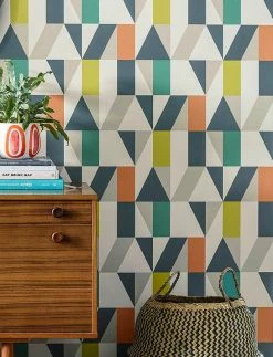 Ein- und Zweidimensionalität auf einen Nenner gebracht – Die geometrische Mustertapete setzt auf eine klare und strenge Formensprache mit Dreieck, Rechteck und Diagonale und erzeugt durch die geschickte Anordnung eine optische Täuschung. Das flotte grafische Design und die abgestimmte Farbwelt sind ideale Partner für den Mid-Century-Stil.