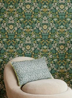Die klassisch anmutende, symmetrische Anordnung der Ornamente löst sich bei näherem Hinsehen auf in eine schier endlose Fülle von Blüten, Früchten und Blattranken. So mischt Josefin unter die Tradition des barocken Blumendesigns eine große Portion skandinavischer Einflüsse. Die stilisierten Blüten wirken natürlicher, die Farben auf dem minttürkisfarbenen Grund sind durch die vorherrschenden Gelb- und Grüntöne frischer und kühler als ihre barocken Vorläufer.