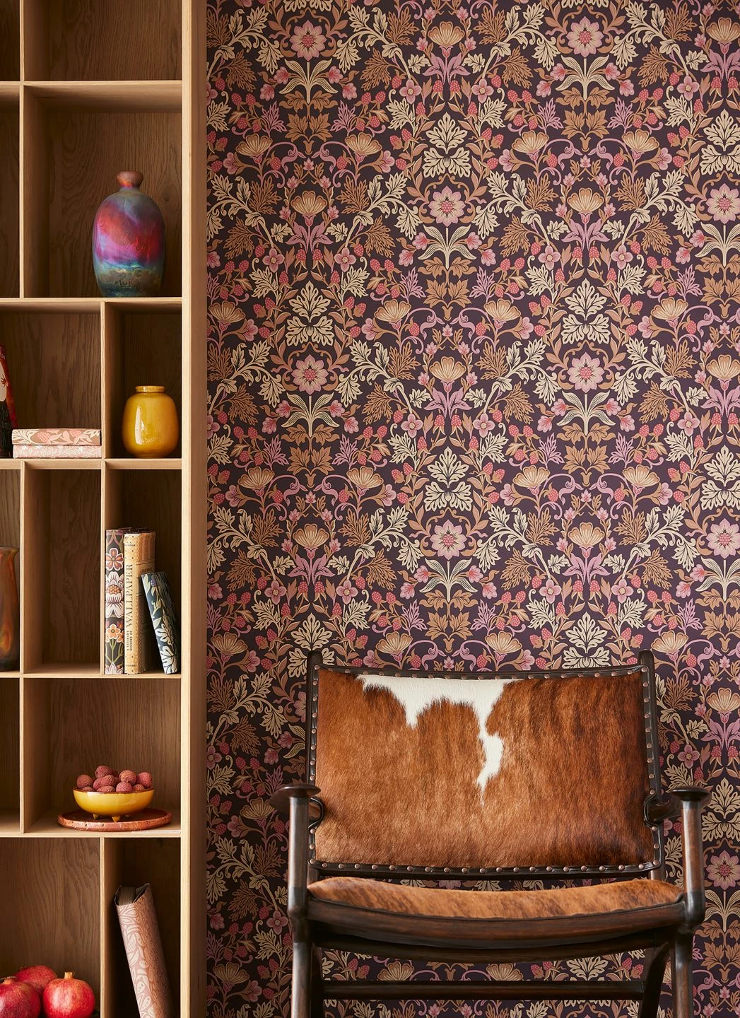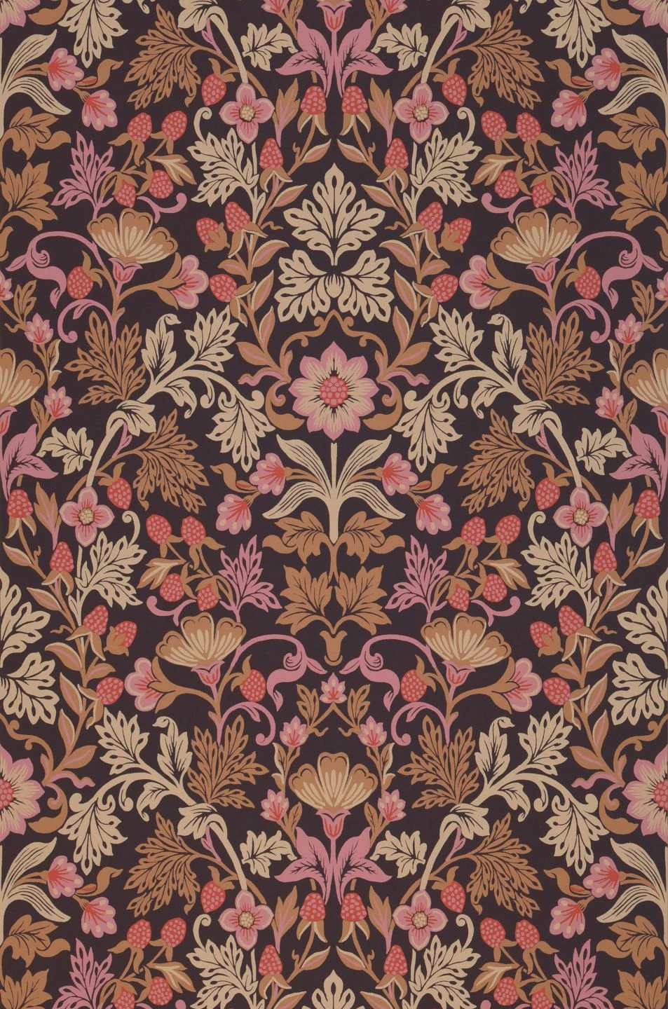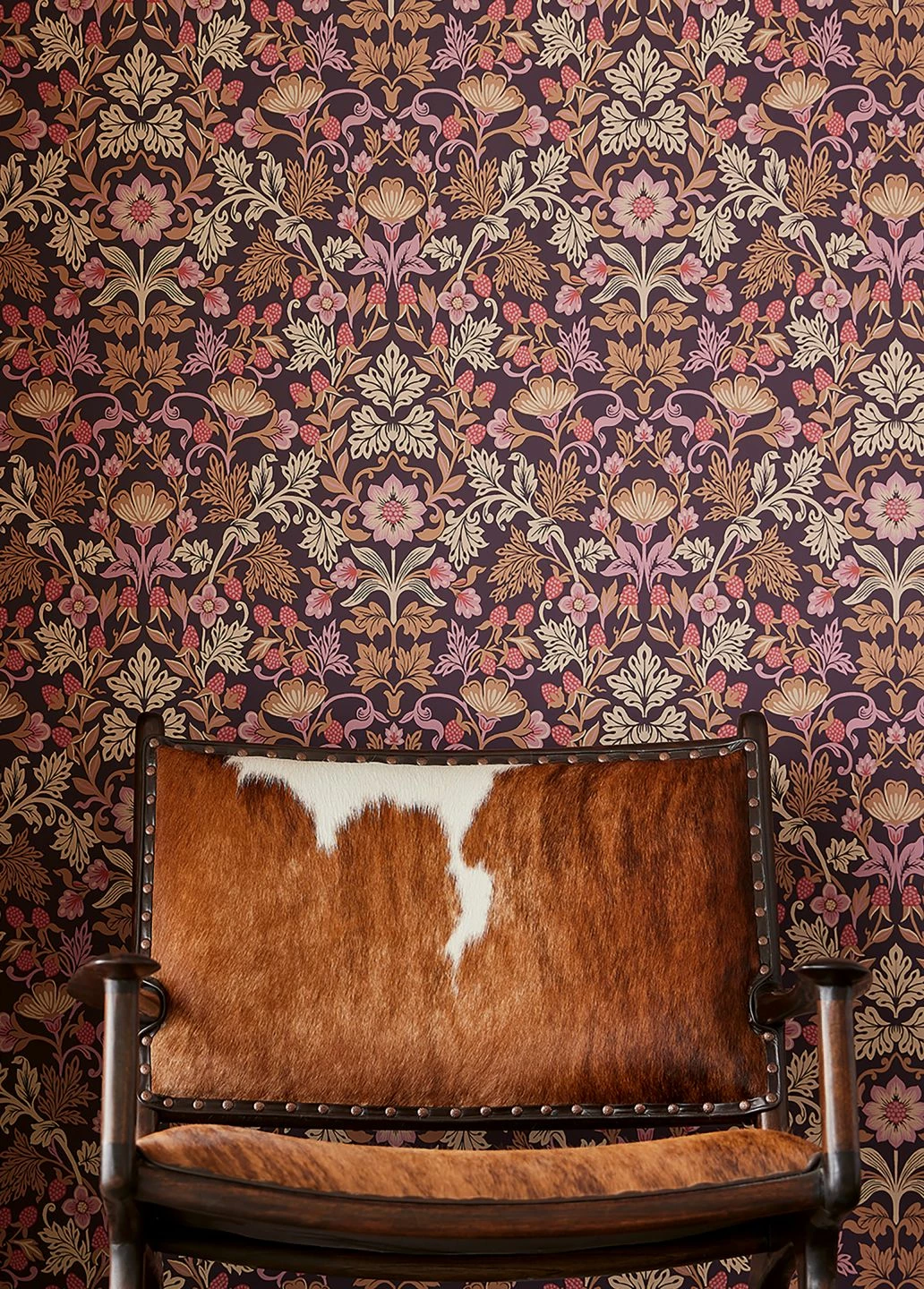 Warme Rot- und Violett-Töne dominieren das Erscheinungsbild von Vliestapete Josefin und üben auf dem außergewöhnlichen schwarzroten Grund eine magnetische Wirkung aus. Das klassische Design erinnert mit seinen stilisierten Blüten und Blattranken und den reifen Erdbeeren in seiner symmetrischen Anordnung an die englische Tapetentradition des 19. Jahrhunderts. Doch in ihrer Farbigkeit und Fülle ist Josefin ein zeitloses Schmuckstück.