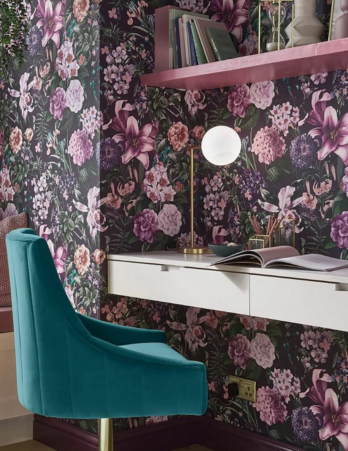 Die Fülle und Vielfalt der prachtvollen Blüten auf dieser Vliestapete ergibt durch die Konzentration auf verschiedene Violett- und Rosatöne neben Hellbraun, Petrol und Tannengrün auf dem schwarzvioletten Grund ein abgerundetes Gesamtbild. Edel und hochwertig wirkt die florale Tapete in Ihrem Wohn- oder Schlafzimmer. Besonders schön passen weiße Möbel oder Einrichtungselemente in einer der Musterfarben, um die Wirkung zu unterstreichen.
