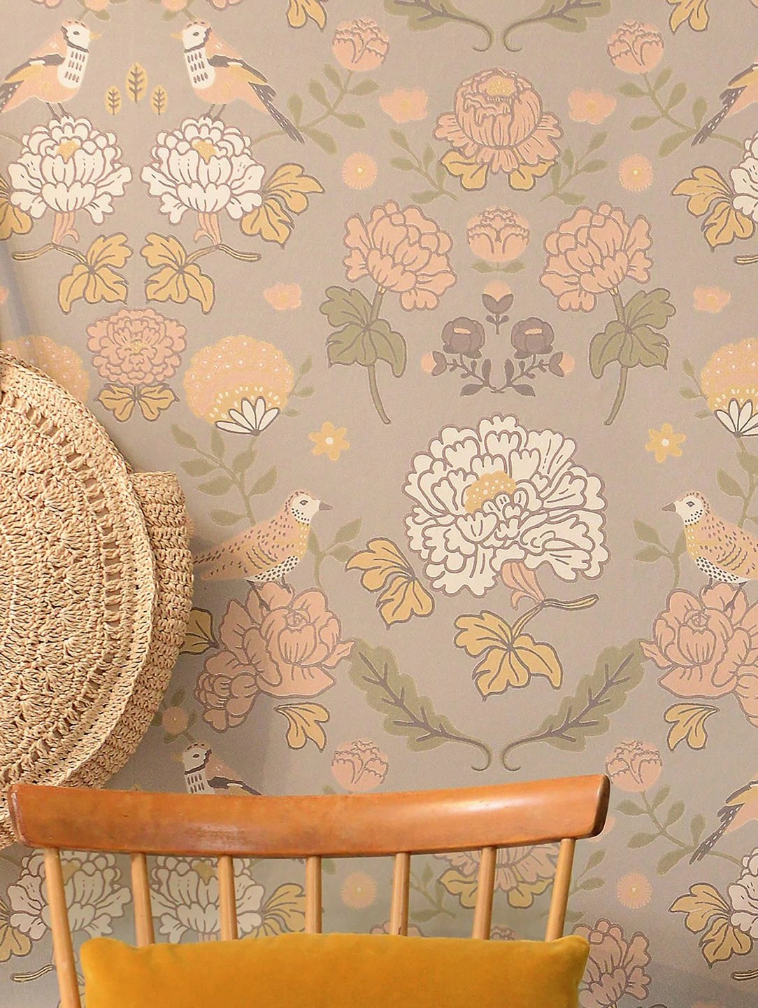 Große Blüten, Blätter und Vögel in Weiß, blassen Grün- und Orangetönen und Sandgelb folgen auf dem hellgrauen Grund der Vliestapete einer zugrundeliegenden Symmetrie. Das Design aus dem Hause Majvillan erinnert an klassische Tapetenentwürfe des britischen Künstlers und Designers William Morris, die es kunstvoll in die heutige Zeit überträgt. Konsequent passt dazu die Herstellung der Tapete im traditionellen Leimdruckverfahren.