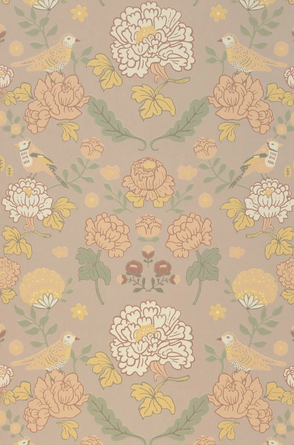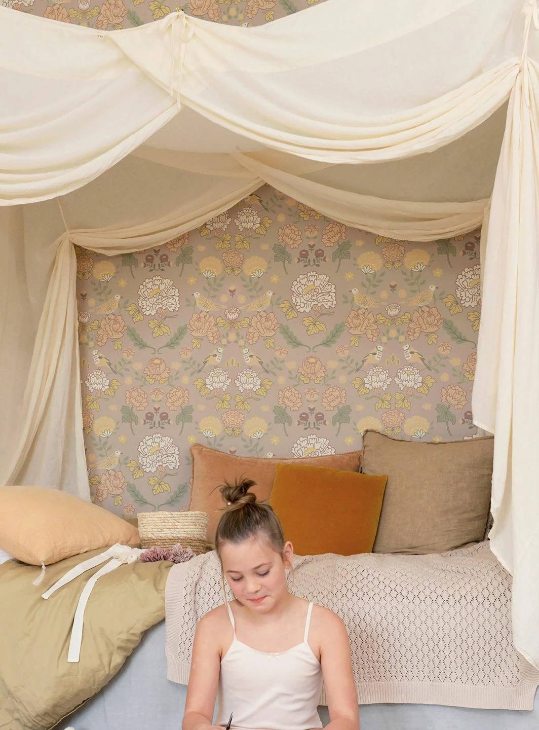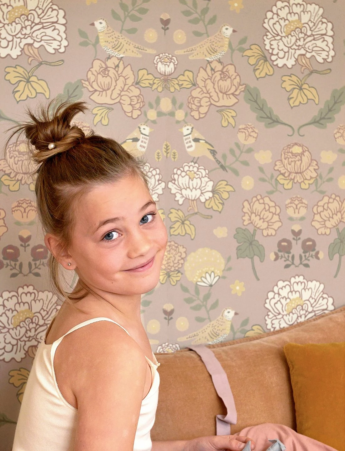 Große und kleine Blumen, Vögel und Blattranken in ruhigen, hellen Grün-, Orange- und Brauntönen auf dem hellgraubeigefarbenen Grund bringen wohldosierte Romantik in ein freundliches Kinderzimmer – ganz ohne dabei kitschig zu wirken. Mit der symmetrischen Anordnung der Motive verströmt „June“ Lebendigkeit und Ruhe zugleich. Die ästhetische Kinderzimmertapete stammt aus dem schwedischen Hause Majvillan und wurde im Leimdruckverfahren hergestellt.