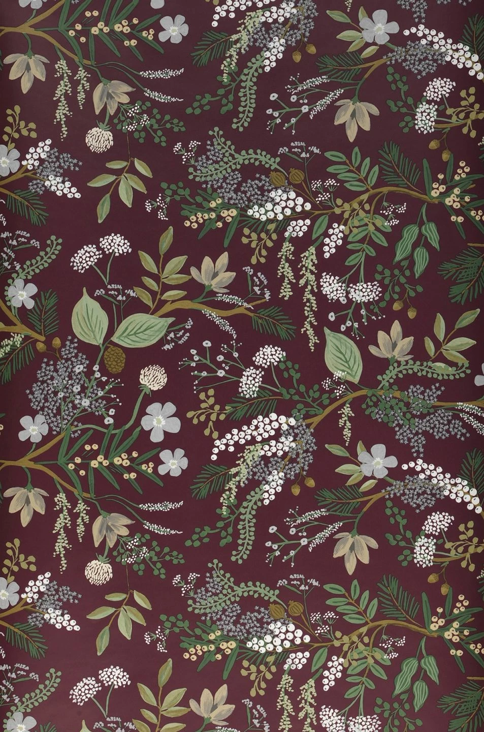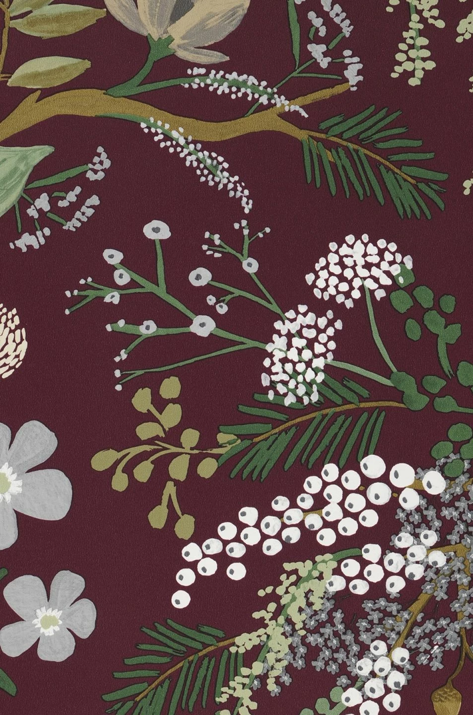 Blüten, Blätter und Beeren in hellen Grün-, Grau und Elfenbeintönen heben sich wunderschön vom bordeauxfarbenen Hintergrund dieser Papiertapete ab. Elegant und gleichzeitig voller Leben ist der Eindruck, der durch die dicht an dicht gemalte Blütenpracht entsteht. Herbstliche Farben spielen mit den einfallenden Sonnenstrahlen und leuchten anheimelnd.