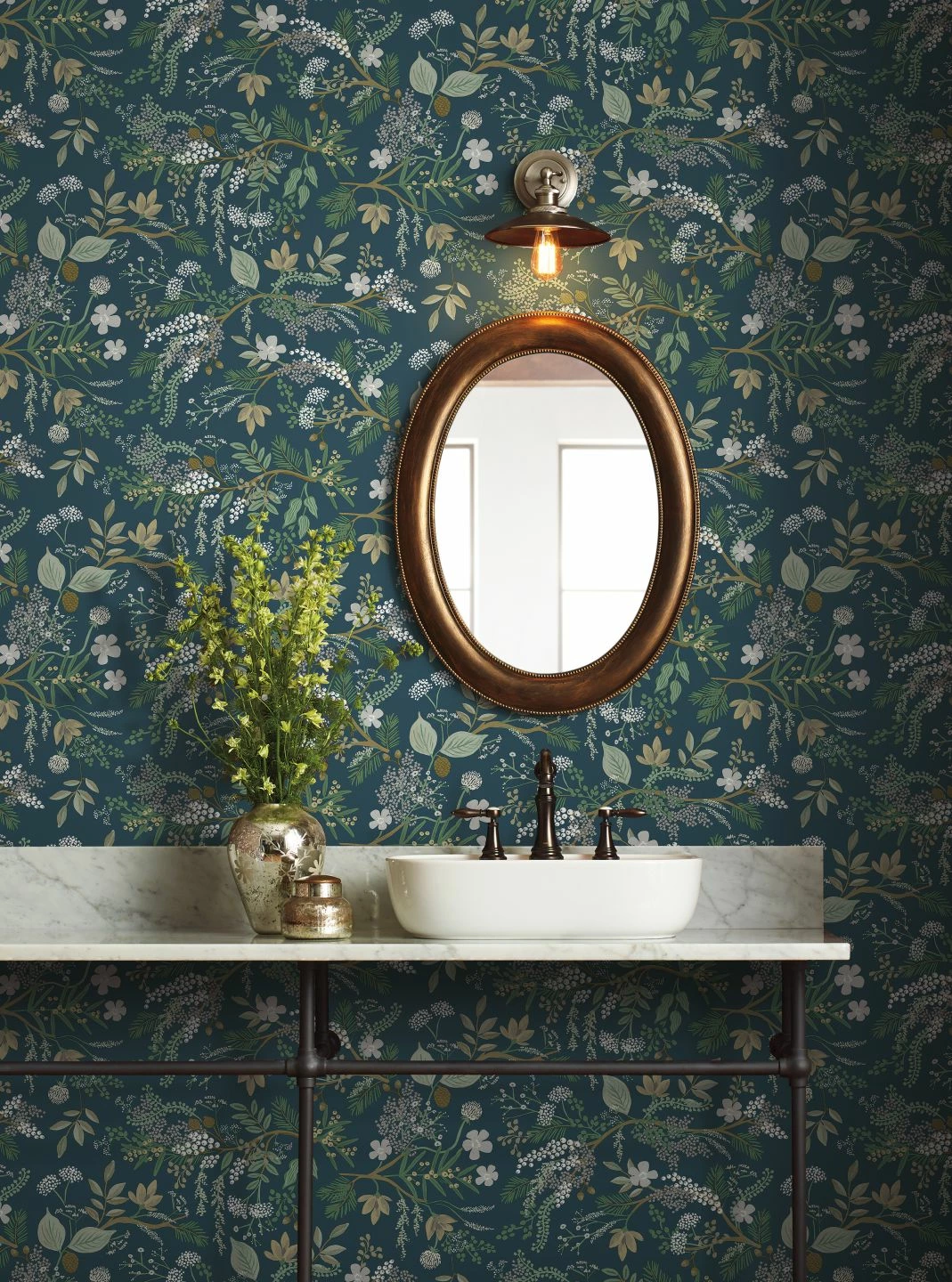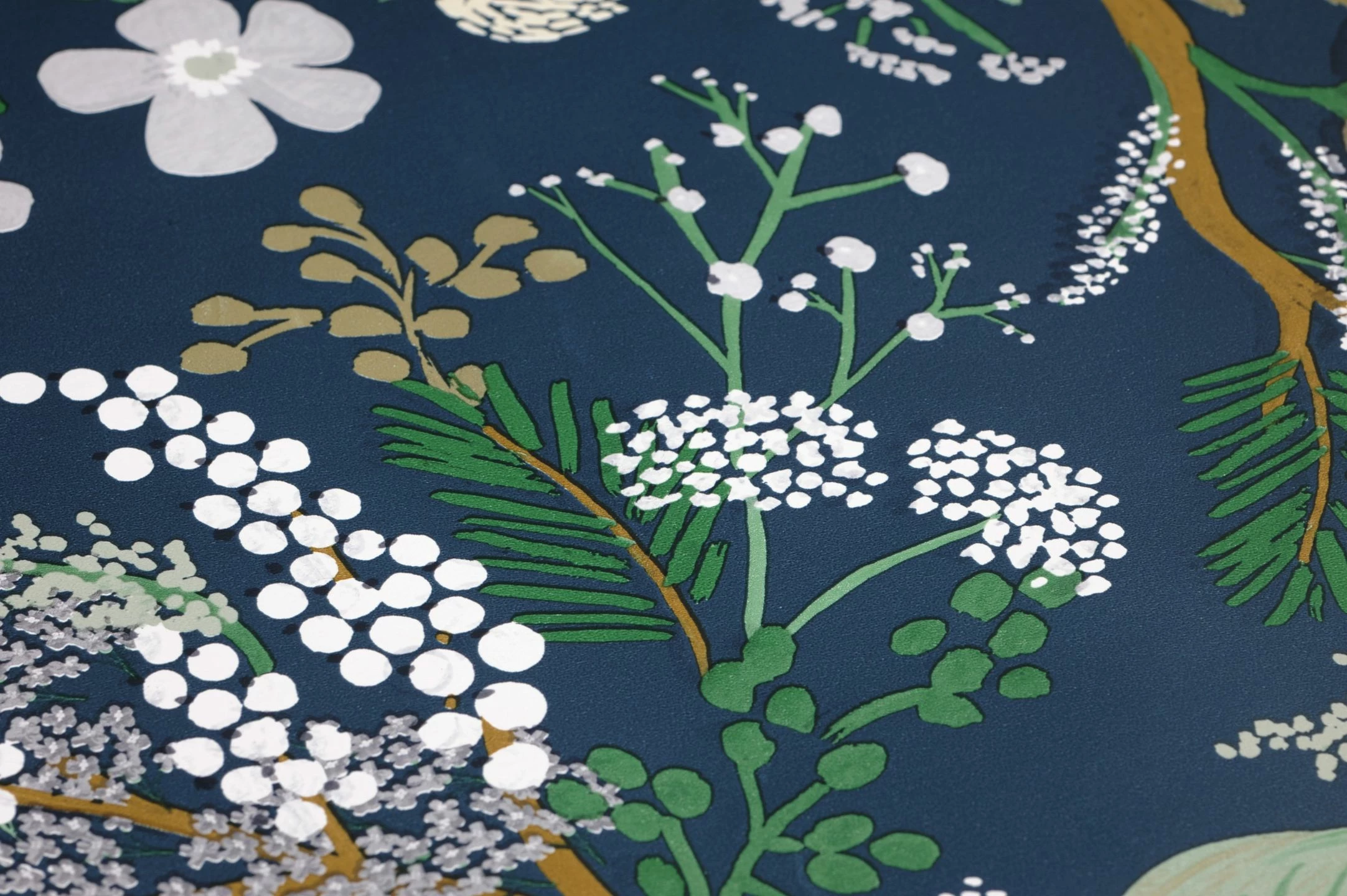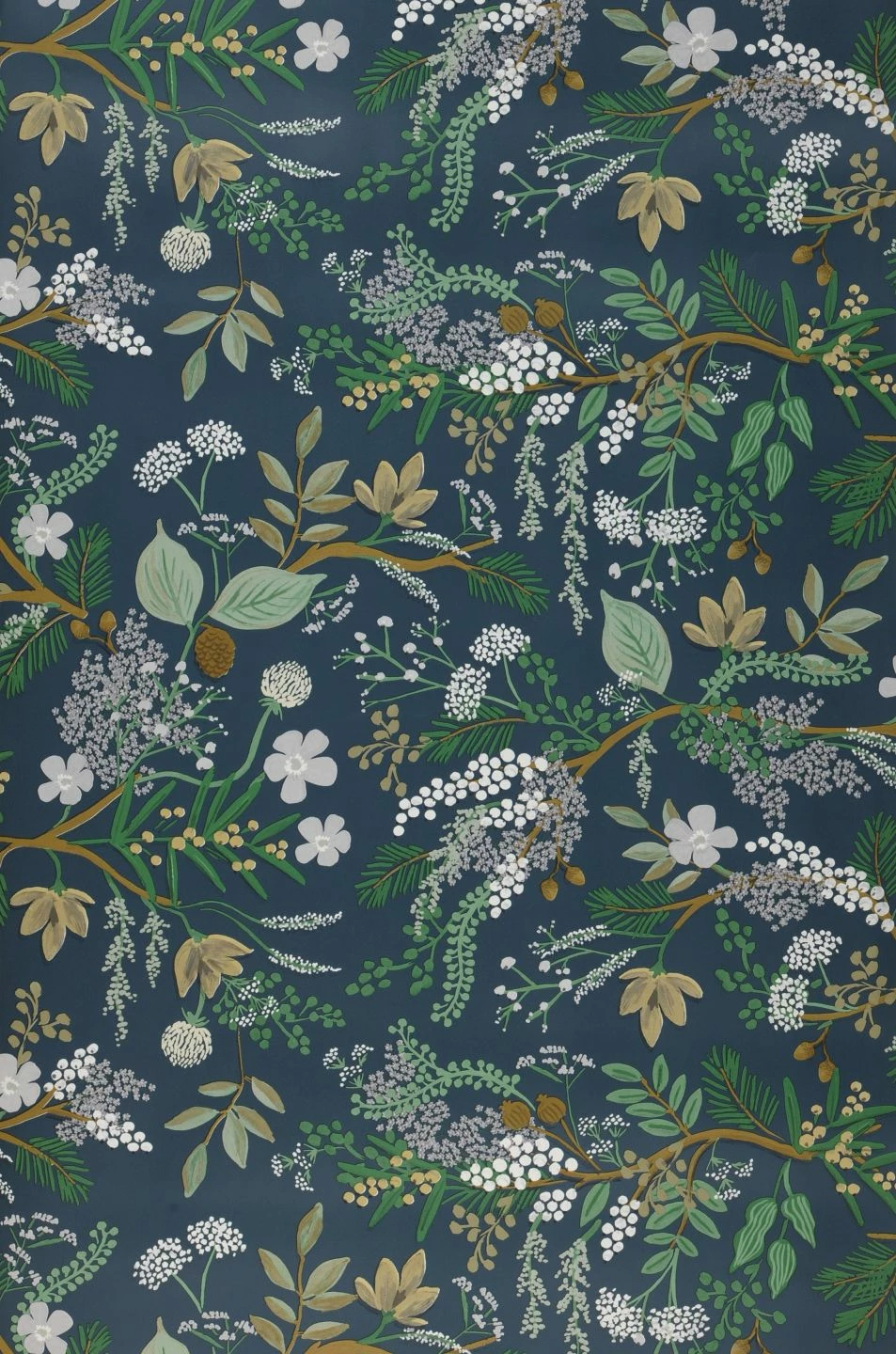 Hochwertig und dekorativ ist diese Papiertapete aus dem Hause Rifle Paper. Die verschiedensten Zweige, Blätter und Blüten wirken wie von Hand mit dem Pinsel auf das Papier getupft. Das harmonische Zusammenspiel der vorherrschenden Grün- und Brauntöne mit dem graublauen Grund kreiert eine stimmige Atmosphäre, die antike Möbel ebenso überzeugend begleitet wie Einrichtungen im Landhaus-Stil.