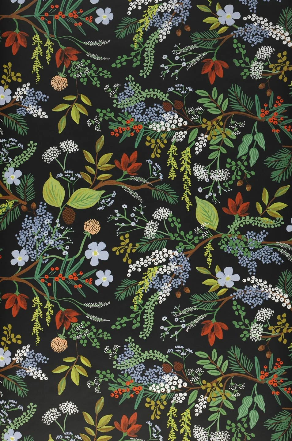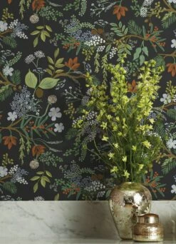 Eine bunte Vielfalt von verschiedenen Blüten, Blättern und Früchten bildet einen lebhaften Gegensatz zum dunklen Untergrund der Papiertapete, der die kräftigen Farben besonders zum Leuchten bringt. Wie mit Pinseln auf das Papier getupft sehen die Blätter und Blüten aus. Durch diese Technik wirkt die Tapete gleichermaßen edel wie leicht.