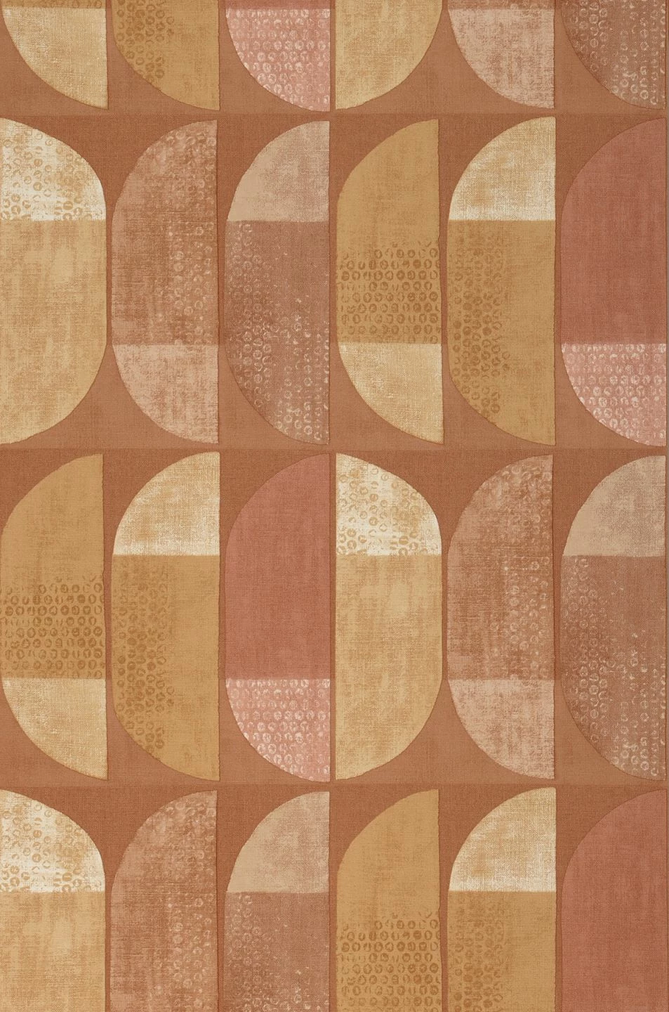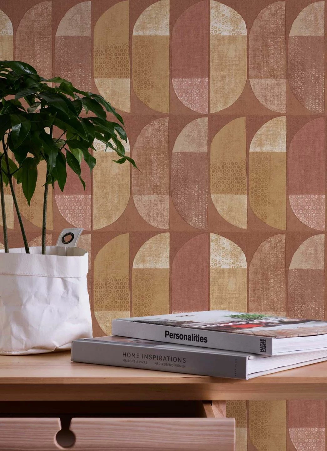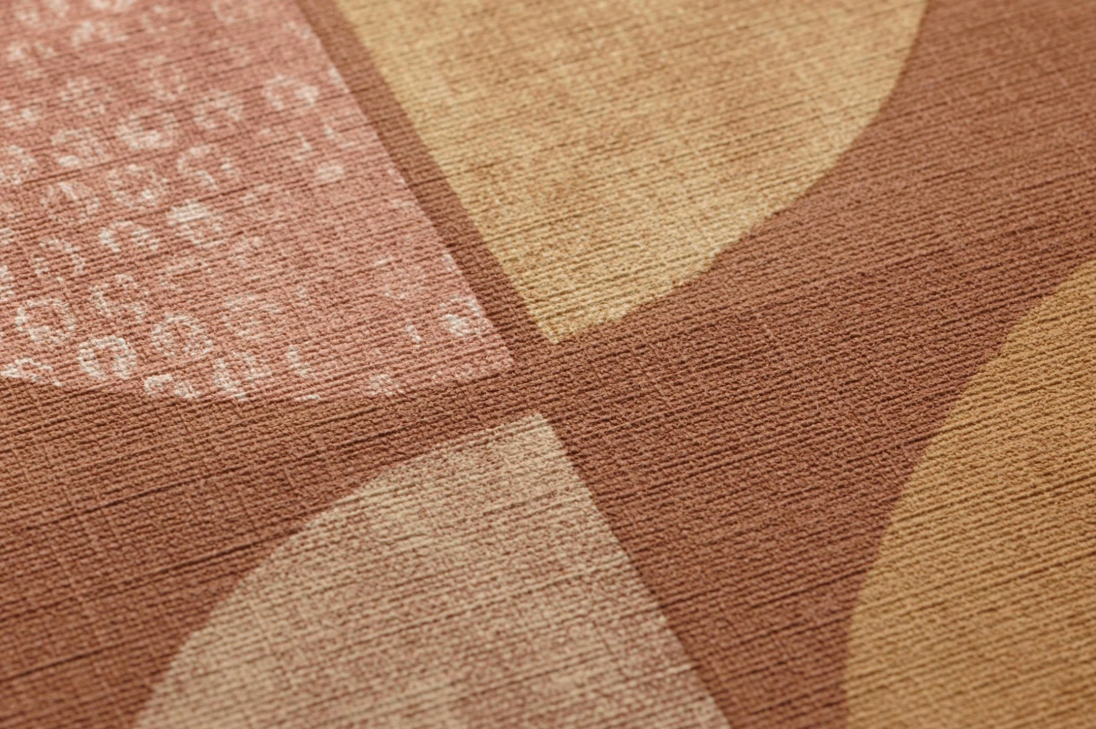 Graphische Elemente aus Ocker, Rosenholz und Hellbraun in verschiedenen Intensitäten, aufgelockert durch eine feine, wie aufgestempelte Musterstruktur, sorgen für einen warmen Farbcharakter. Eine der Besonderheiten dieser Vliestapete liegt in ihrem Oberflächenmaterial: Das Vinyl hat eine fühlbare textilähnliche Struktur wie ein gewebter Stoff und ist so beschaffen, dass Sie die Tapete sogar im Badezimmer einsetzen können.