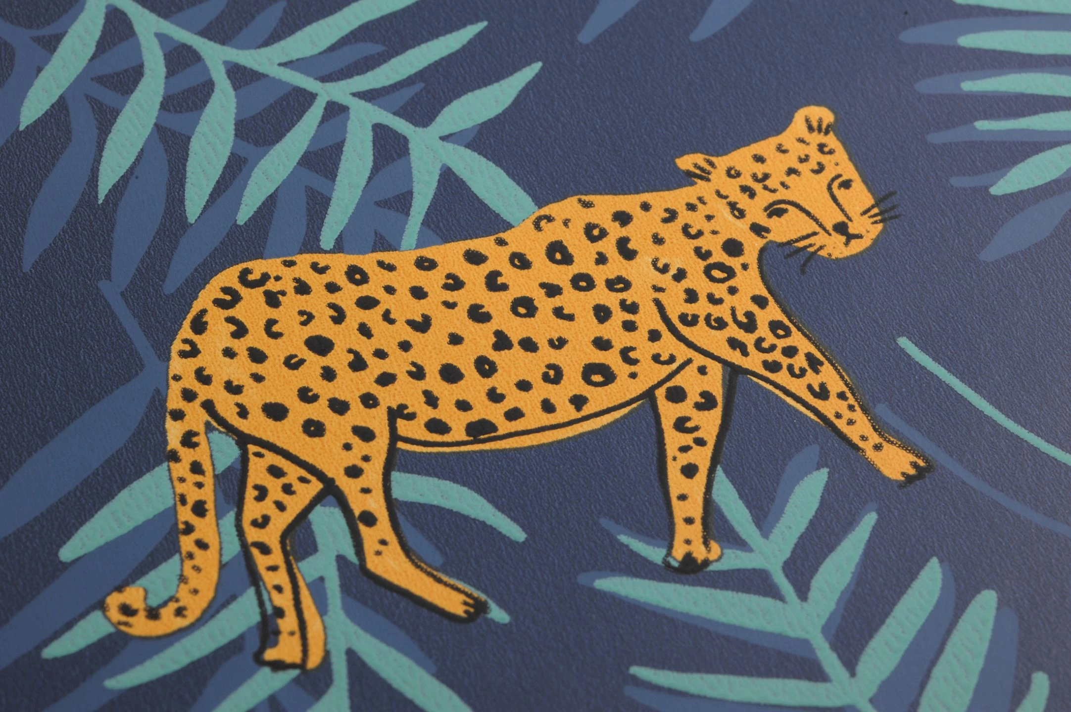 Palmwedel und erikaviolette Blüten sorgen für eine exotische Atmosphäre – aber im Mittelpunkt stehen die schön gezeichneten Leoparden im leicht folkloristisch angehauchten Stil! Auf dem graublauen Grund fällt ihr goldgelbes Fell mit den charakteristischen Tupfen besonders ins Auge, während das Violett der Blumen und das Minttürkis und Brillantblau der Palmenzweige einen harmonischen Hintergrund ergeben.