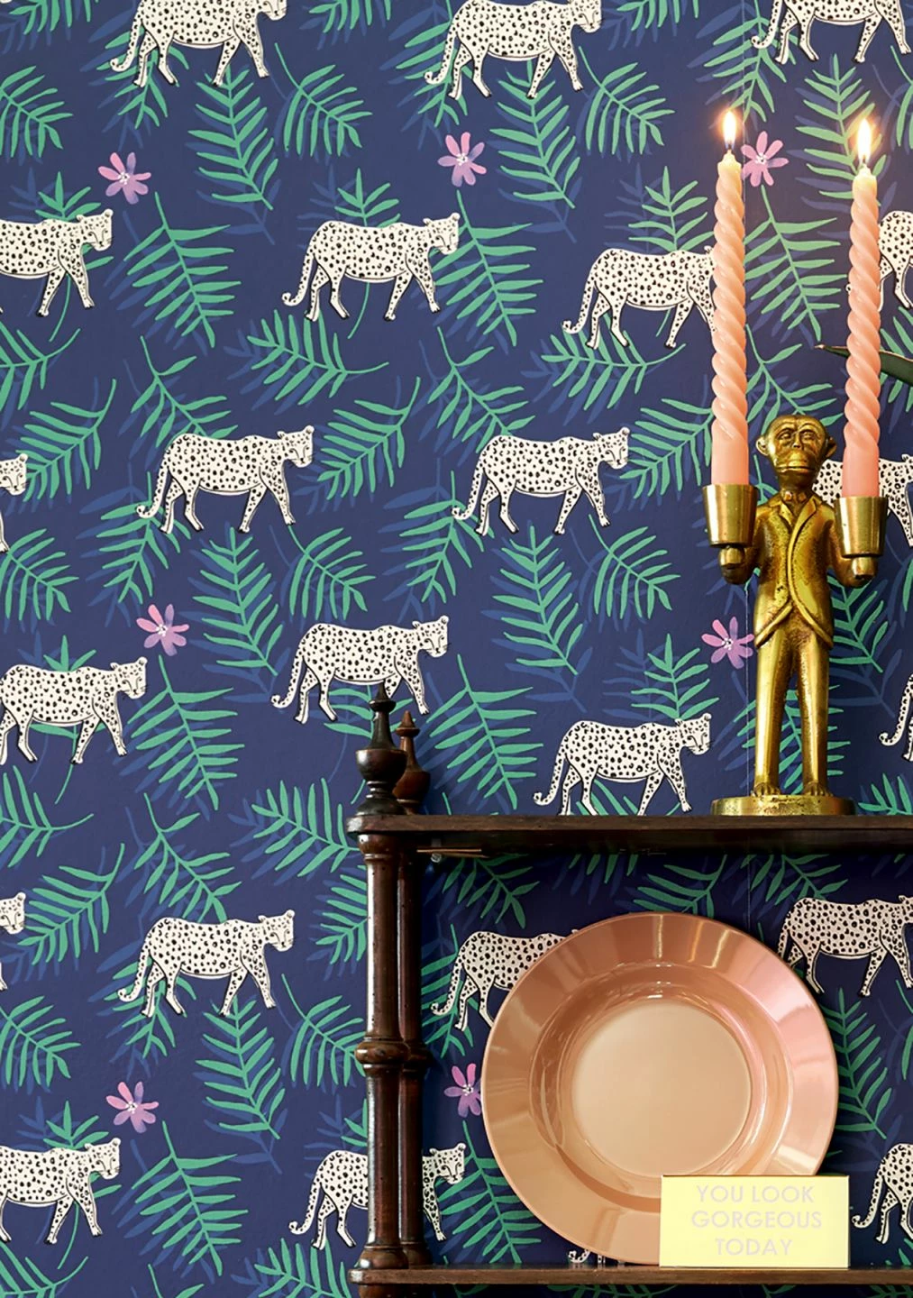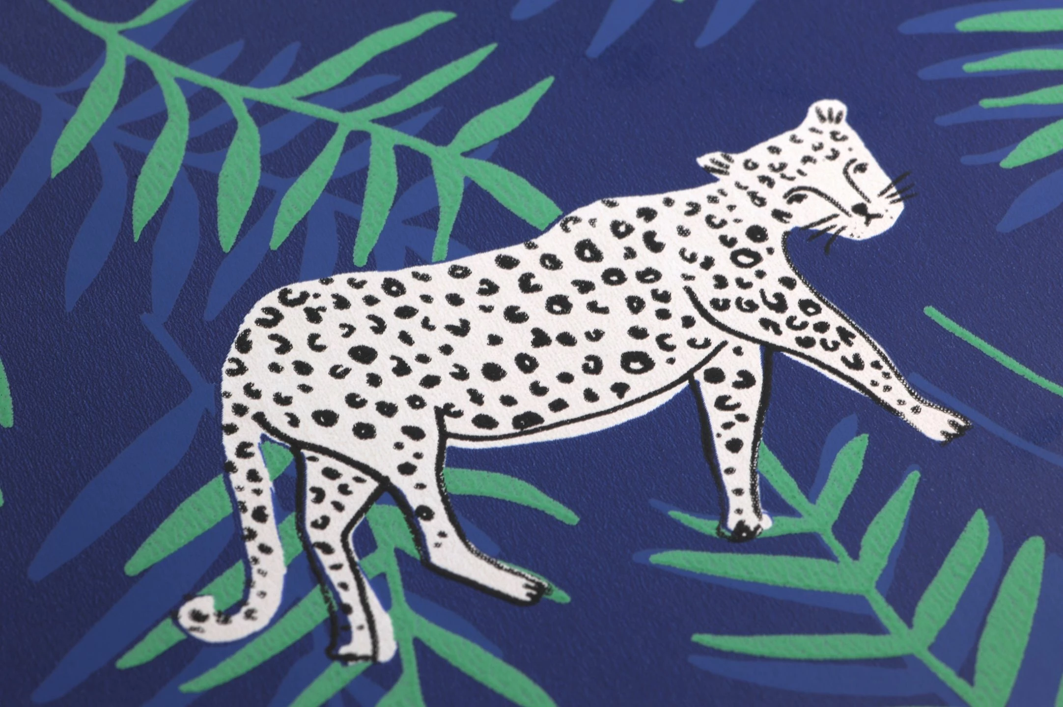 Saphirblau wie eine Tropennacht ist der Untergrund dieser exotischen Tiermotiv-Tapete. Zwischen filigranen Palmwedeln in Patinagrün und Violettblau und zarten hellvioletten Blüten leuchtet das weiße Fell von Leoparden mit ihrer typischen Fleckenzeichnung hervor. Weiße Einrichtungsgegenstände, aber auch antike Möbel in dunklen Holztönen schaffen einen Raum mit einer ganz individuellen Atmosphäre.