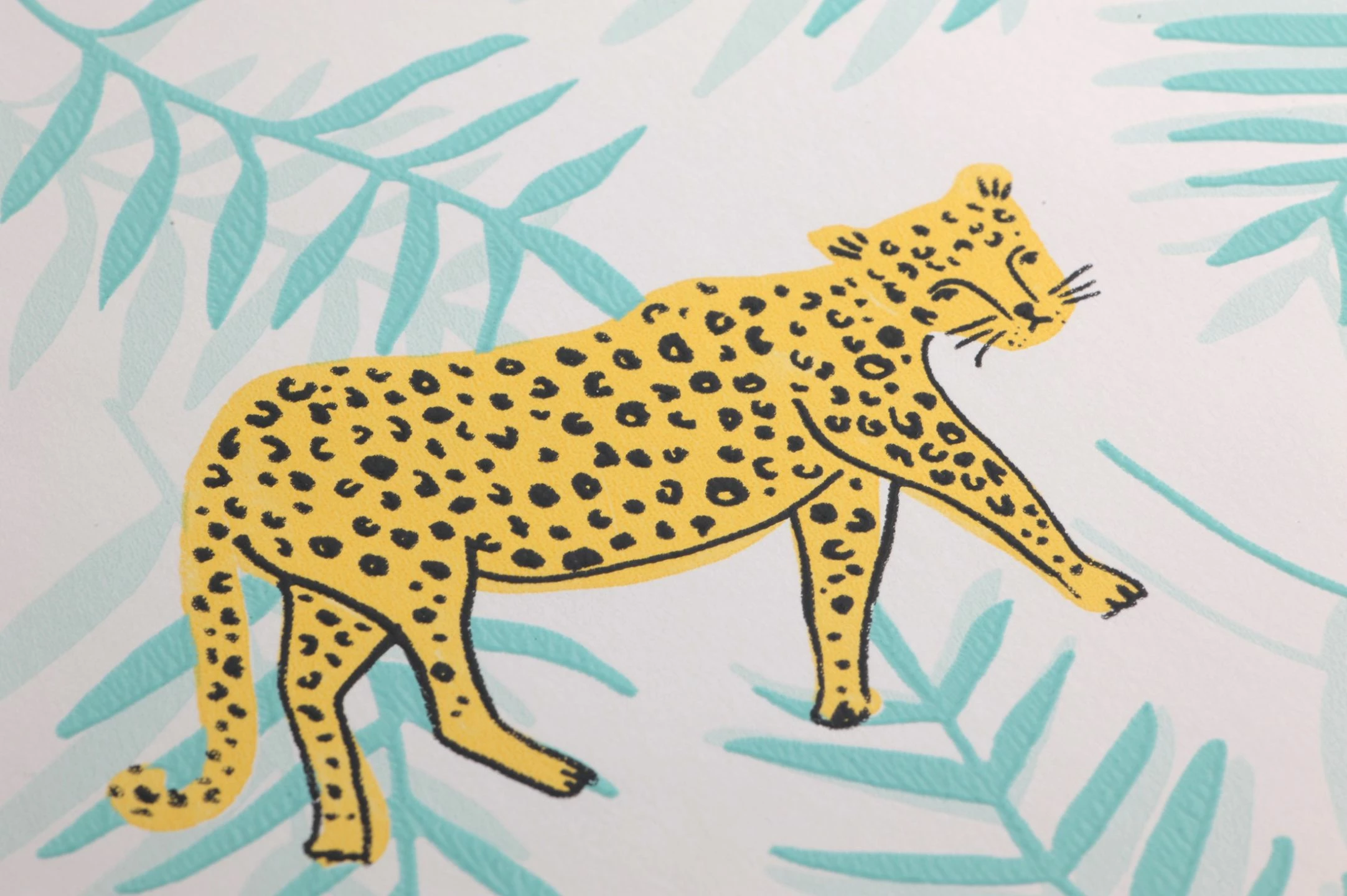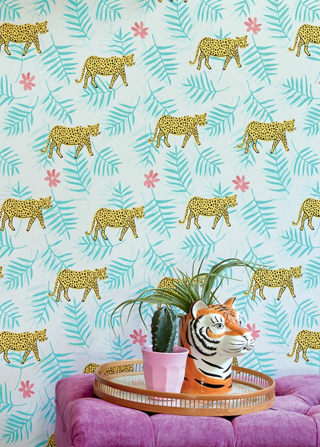 Leuchtend gelb mit ihrem typischen gefleckten Fellmuster heben sich Leoparden vom weißen Grund der Vliestapete ab. Zwischen den geschmeidigen Raubkatzen unterstützen Palmwedel in Schattierungen von Minttürkis sowie zarte erikaviolette Blüten die exotische Atmosphäre. „Kabbo“ eignet sich für ein phantasievolles Kinderzimmer ebenso wie für ein ausgefallenes Schlaf- oder Wohnzimmer. Ihrer Kreativität sind keine Grenzen gesetzt!