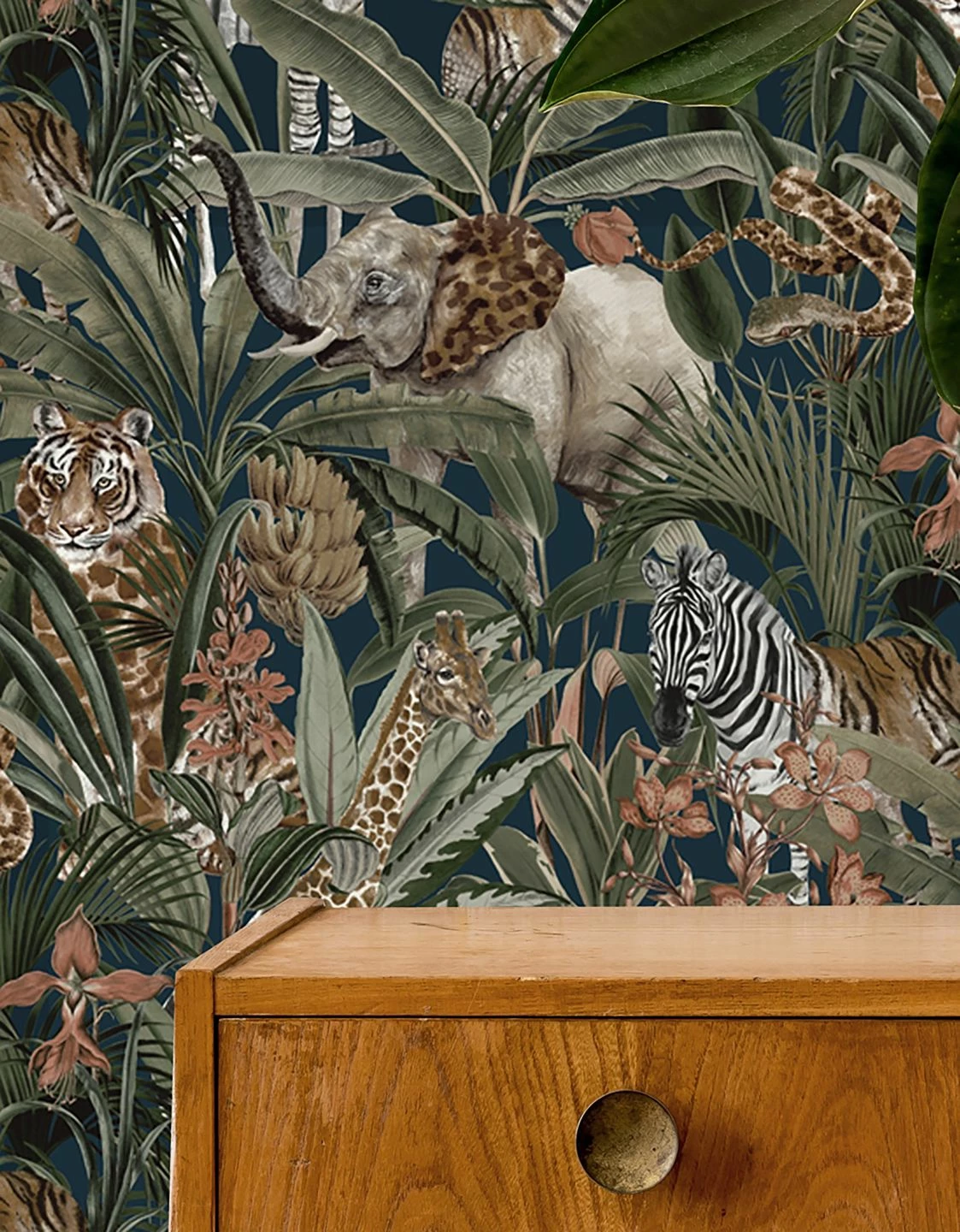 Auf den ersten Blick wirken die abgebildeten Tiere fast fotorealistisch in der Fülle an Details. Erst bei genauerem Hinsehen offenbart sich das Geheimnis des Designs: Da hat das Ohr des Elefanten Flecken wie das Fell eines Leoparden, die Streifen des Zebras gehen in die eines Tigers über, die Flecken der Giraffe werden zur schwarzweißen Zeichnung des Zebras. Gekonnt lässt Tapete Kanajawa Sie Vertrautes neu entdecken und bebildert phantasievoll Ihren Raum.