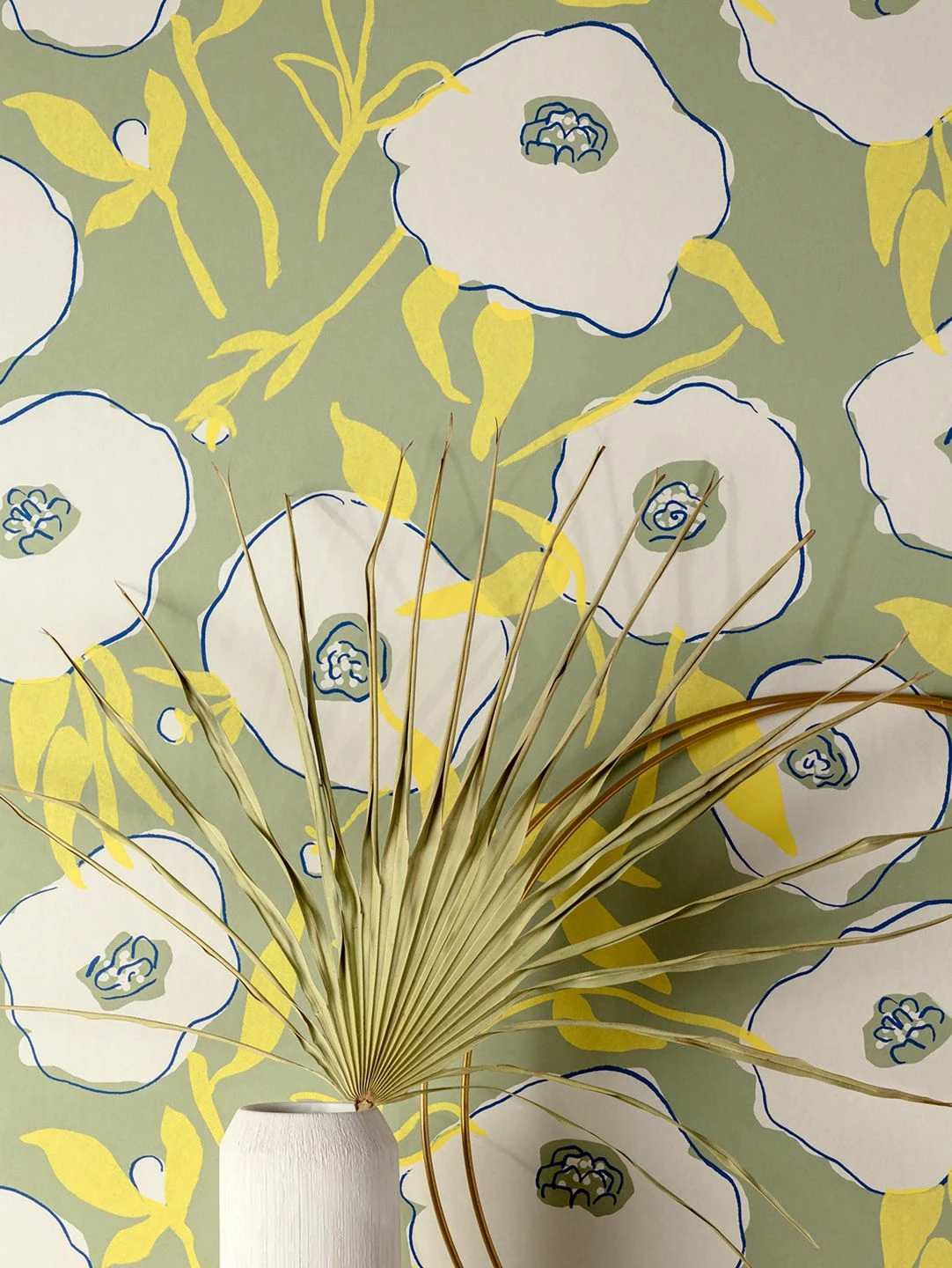 Wie ein modernes, expressives Kunstwerk mutet die florale Tapete Kanoko mit ihren stilisierten Blumen an. Auf dem blassgrünen Grund genügen kühne Pinselstriche in Hellgelb, weiße Flächen und ultramarinblaue Umrisse, um die Blumen anzudeuten und eine ungeheuer lebendige Wirkung zu erzielen. Die hellen Farben lassen die Tapete frühlingshaft erscheinen, so als würde die Sonne durch Ihr Fenster scheinen.
