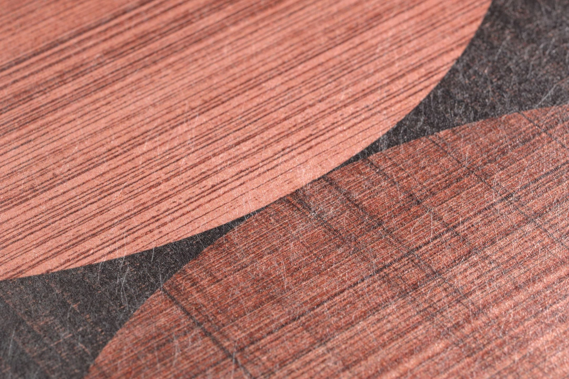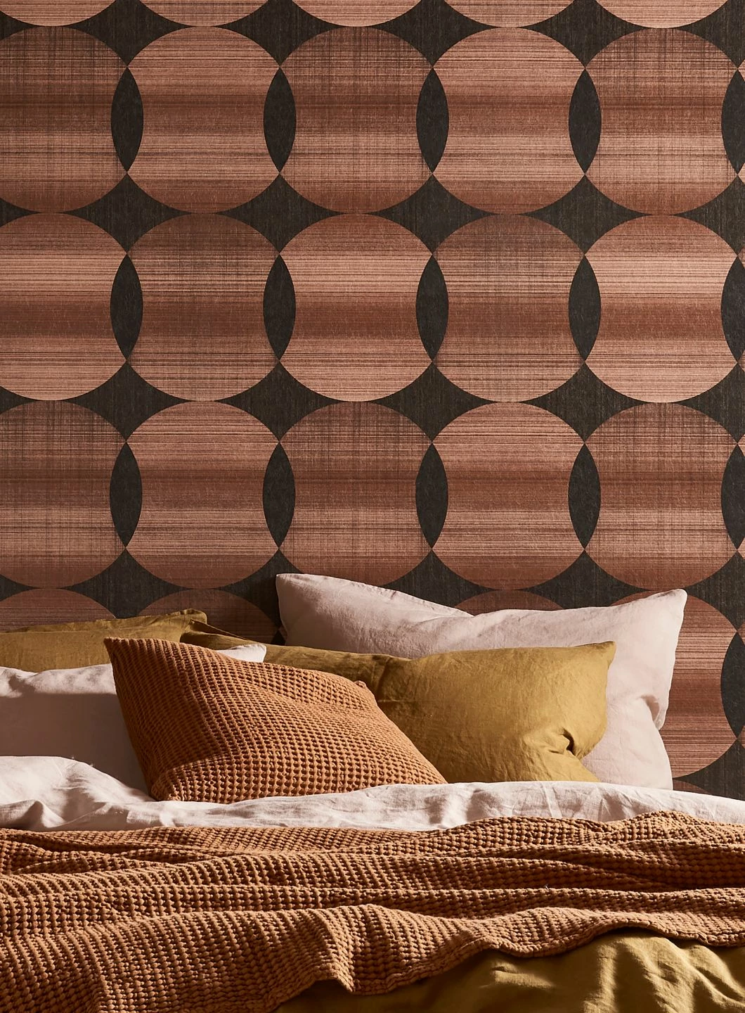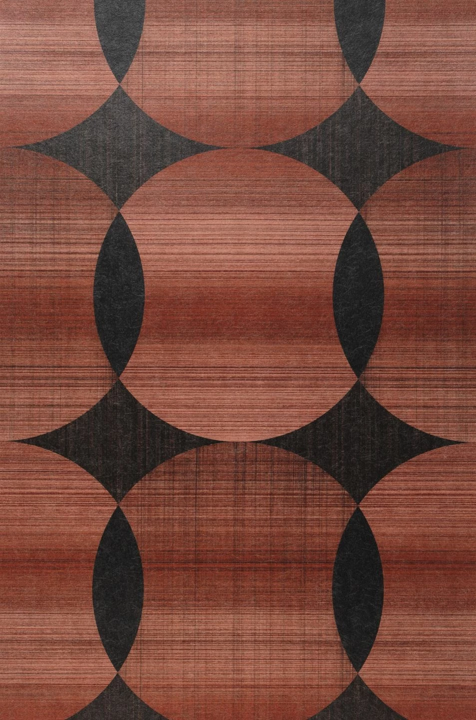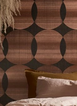 Wie ein kunstvolles Gewebe aus Fäden in warmen, leicht schimmernden Kupfertönen wirken die geometrischen Ornamente auf der Vliestapete „Kasavu“. Die Struktur der verschiedenen Nuancen von Kupfer und Schwarzgrau sorgen für die textile Anmutung. Die großflächigen, sich überlappenden Kreise bilden ein ruhiges, regelmäßiges Muster und einen extravaganten Wandschmuck, der sich wunderbar mit Erdfarben kombinieren lässt.